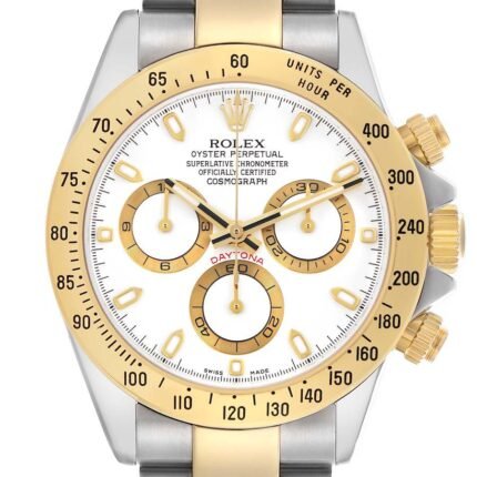Two-tone Rolex Daytona automatic chronograph with white dial and yellow gold/stainless steel bracelet. 40mm case. Comes with box
