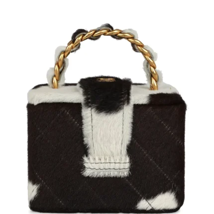 Vintage Chanel Cow Print Vanity Box in pony hair with gold hardware for sale. A rare and stylish addition to any luxury collection.