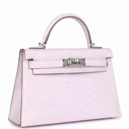 Authentic Hermès Kelly Sellier 20 in Mauve Pale Boreal Satin Alligator with Palladium hardware for sale. Rare color, mini size. Includes full set. Limited availability.