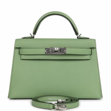 Mini Hermès Kelly Sellier 20 in Vert Criquet green with Epsom leather and Palladium hardware for sale. A premium luxury handbag for day or evening wear. Authenticity guaranteed.