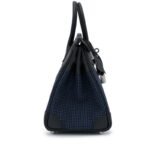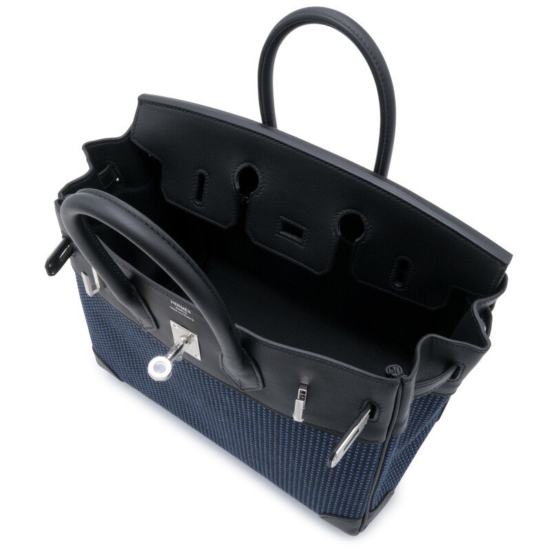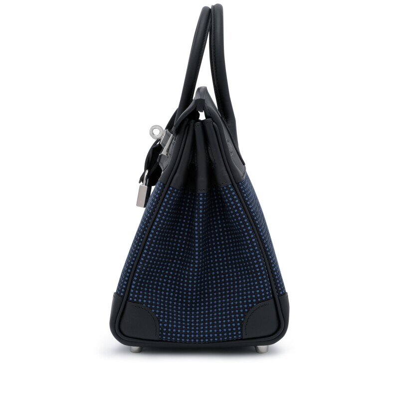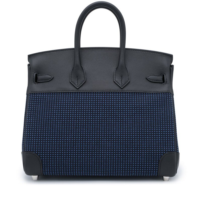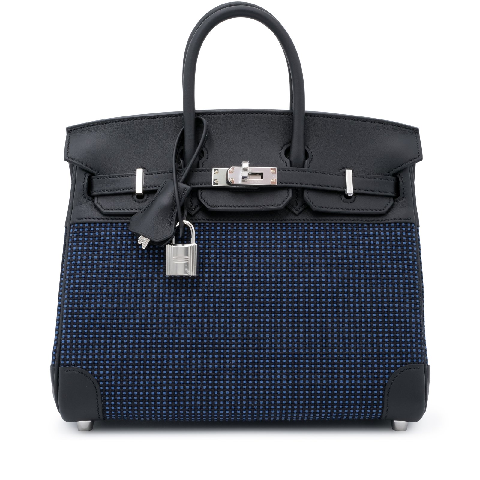Hermès Black Swift and Bleu Egee Bivouac Toile Birkin 25 Palladium Hardware, 2024 for sale. The interior is lined with tonal leather. Includes clochette, lock, keys, felt, care booklet, dust bag and box. This item is final sale and not eligible for return