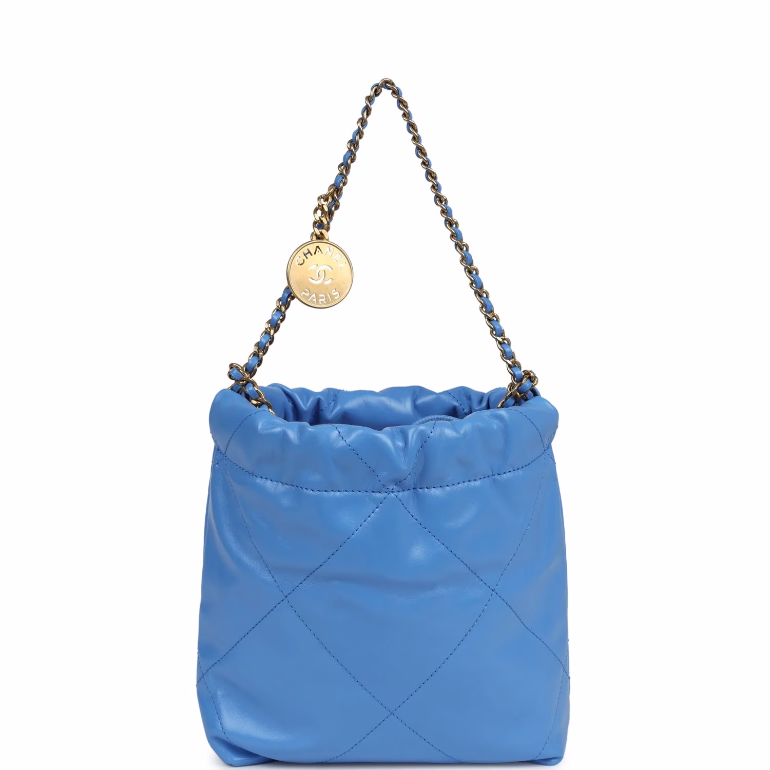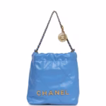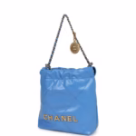 Add a touch of effortless elegance with the Chanel Mini 22 Bag blue shiny aged calfskin, finished with signature gold-tone hardware. This chic mini features the iconic Chanel drawstring design with the “CHANEL” logo charm and classic chain strap for versatile shoulder or crossbody wear. Its lightweight structure and glossy finish make it the perfect accessory for both casual and dressy occasions.