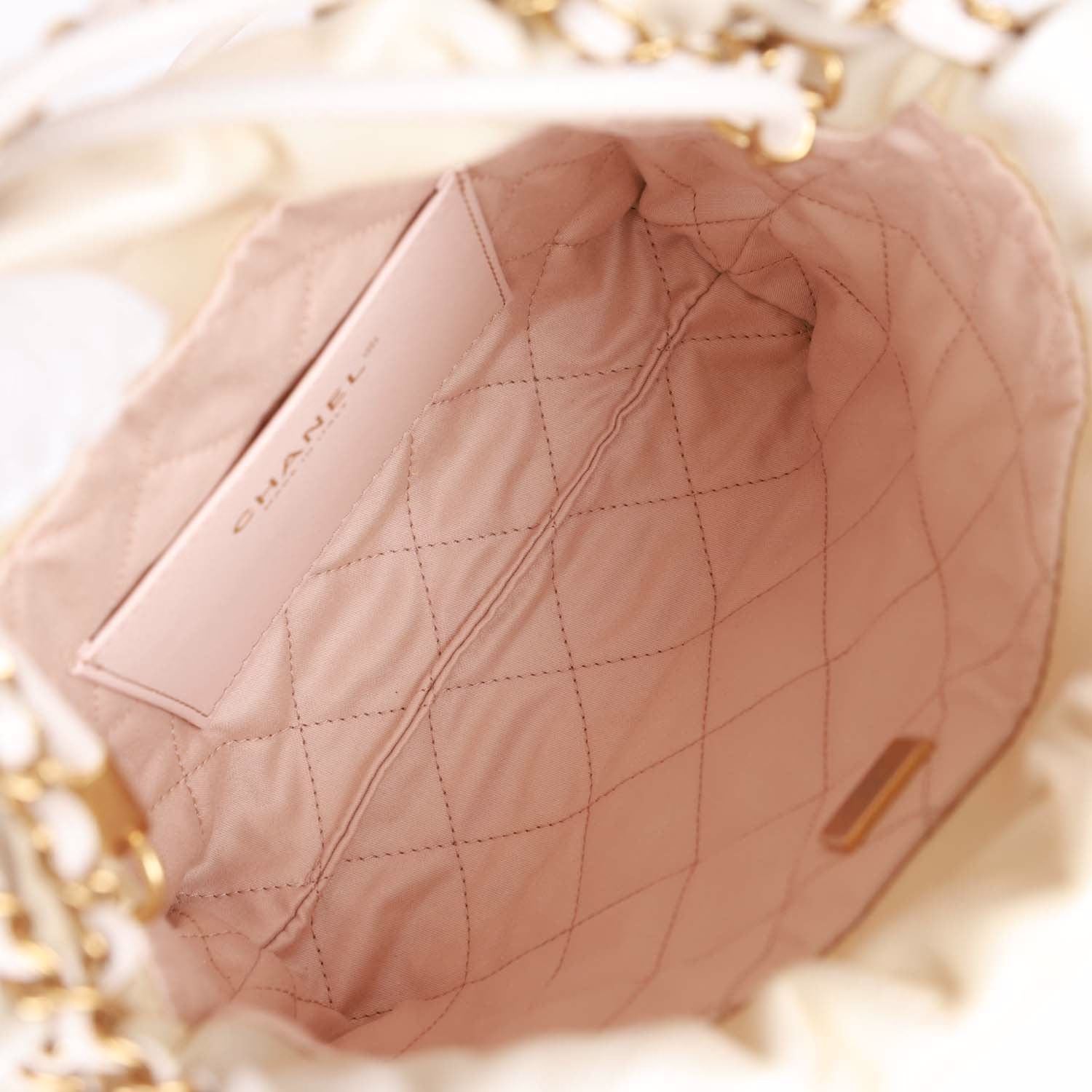 Chanel Mini 22 Champagne Iridescent Bag for sale. The interior is lined in Peach fabric with one slip pocket on the rear wall.