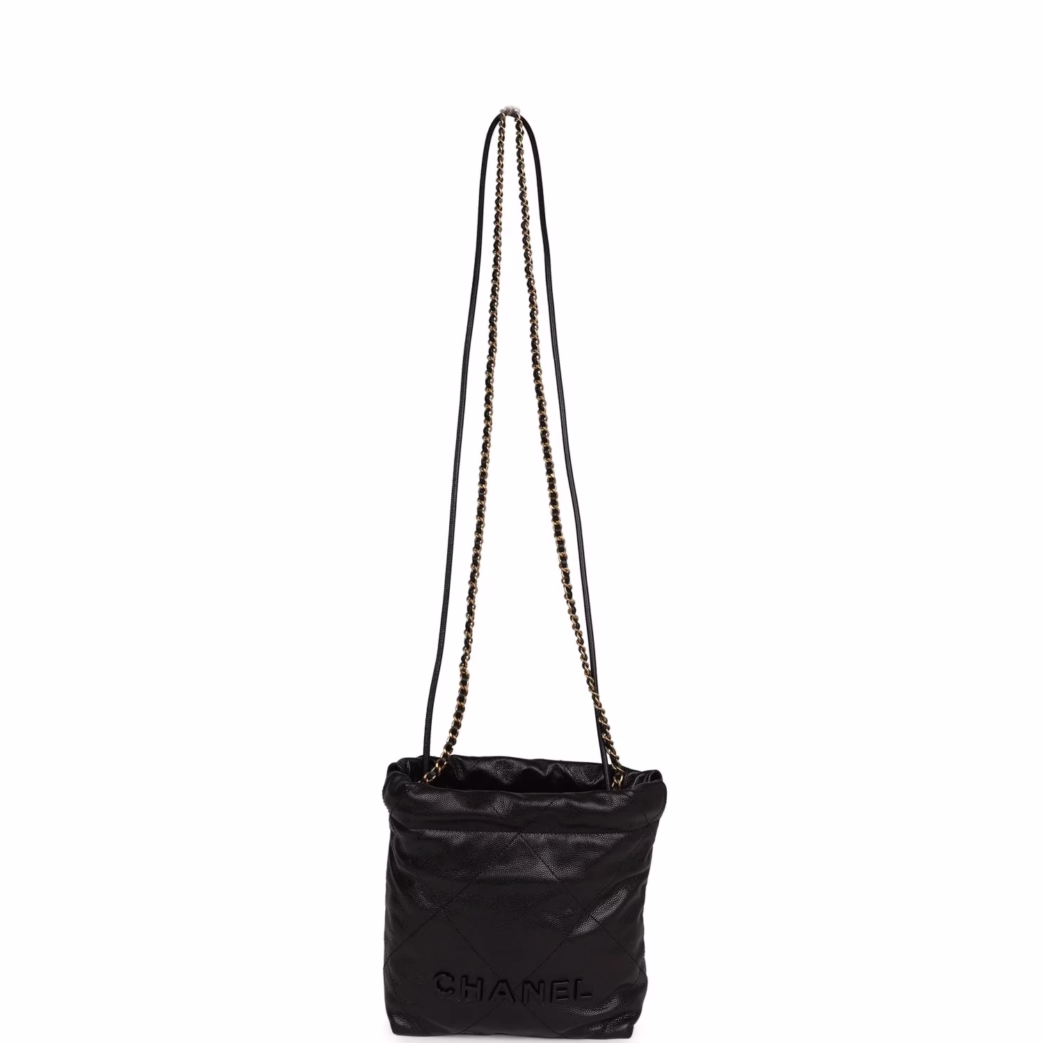 Iconic and effortlessly chic, the Chanel Mini 22 Bag in luxurious black pebbled calfskin is finished with gleaming gold-tone hardware. Lightweight yet structured, this sought-after piece is the ultimate day-to-night luxury companion. Timeless Chanel elegance in a compact silhouette.
