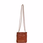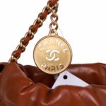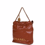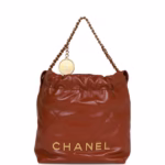 The Chanel Mini 22 Bag in warm brown calfskin features signature gold-tone hardware and a soft, slouchy silhouette that’s equal parts elegant and edgy. A compact yet iconic design, perfect for daily wear or casual luxe evenings.