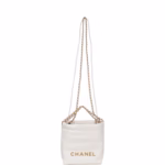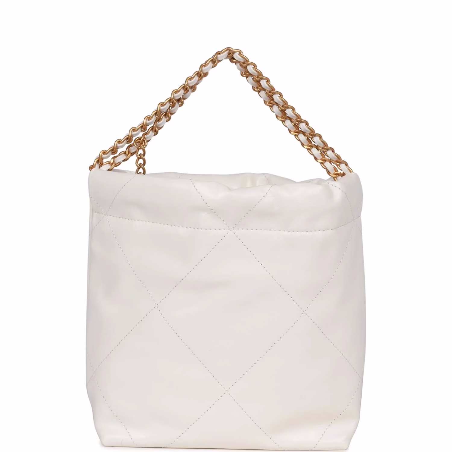 Effortlessly chic, the Chanel Mini 22 Bag in crisp white calfskin leather features iconic antique gold hardware and signature drawstring detail. This compact luxury essential adds timeless elegance and versatility to any wardrobe—ideal for day-to-night wear.