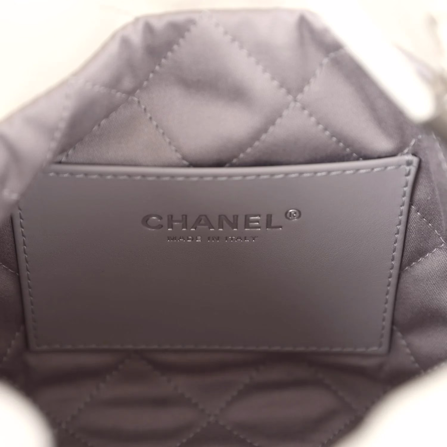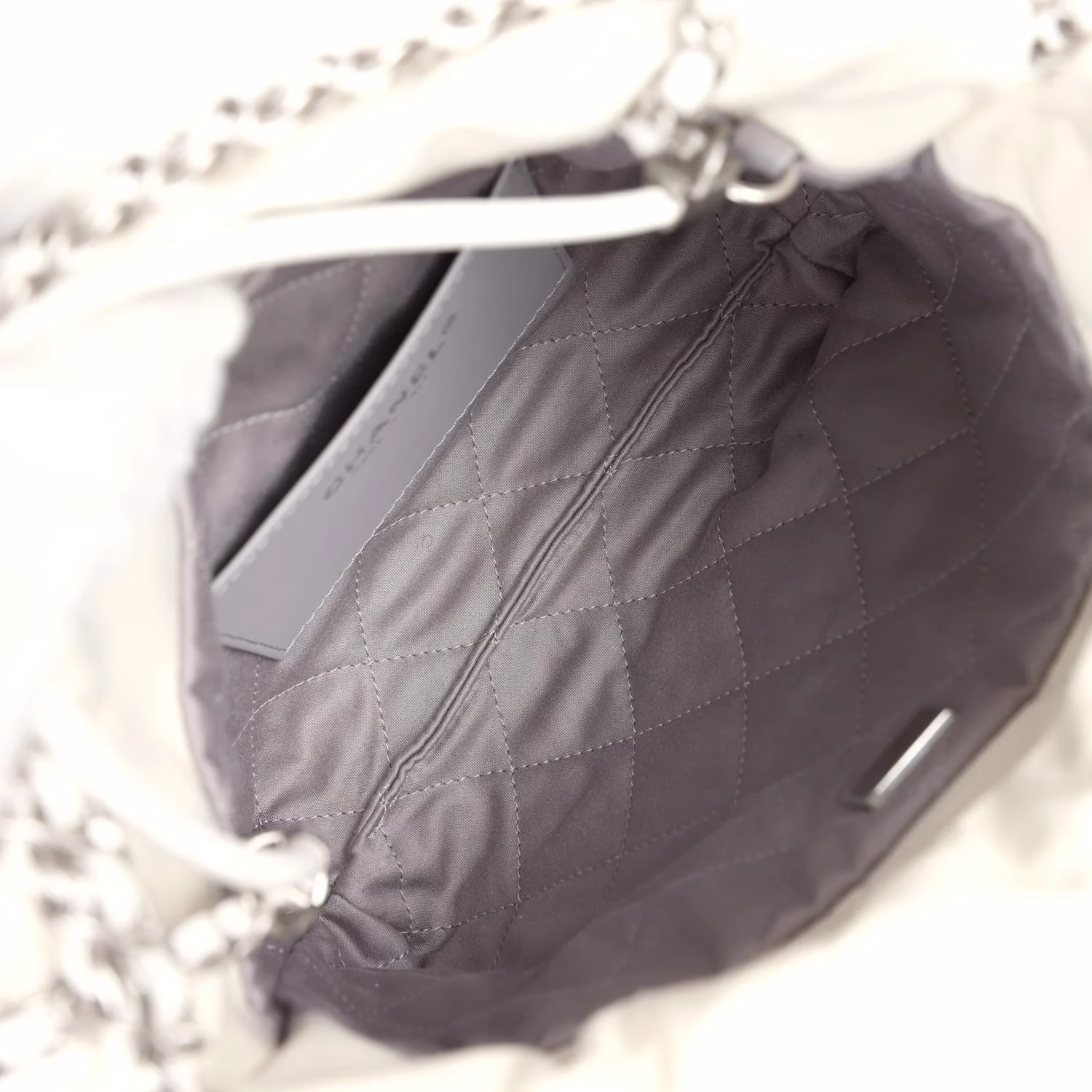 Chanel Mini 22 White Silver Bag for sale. The interior is lined in a dark grey fabric with one slip pocket on the rear wall