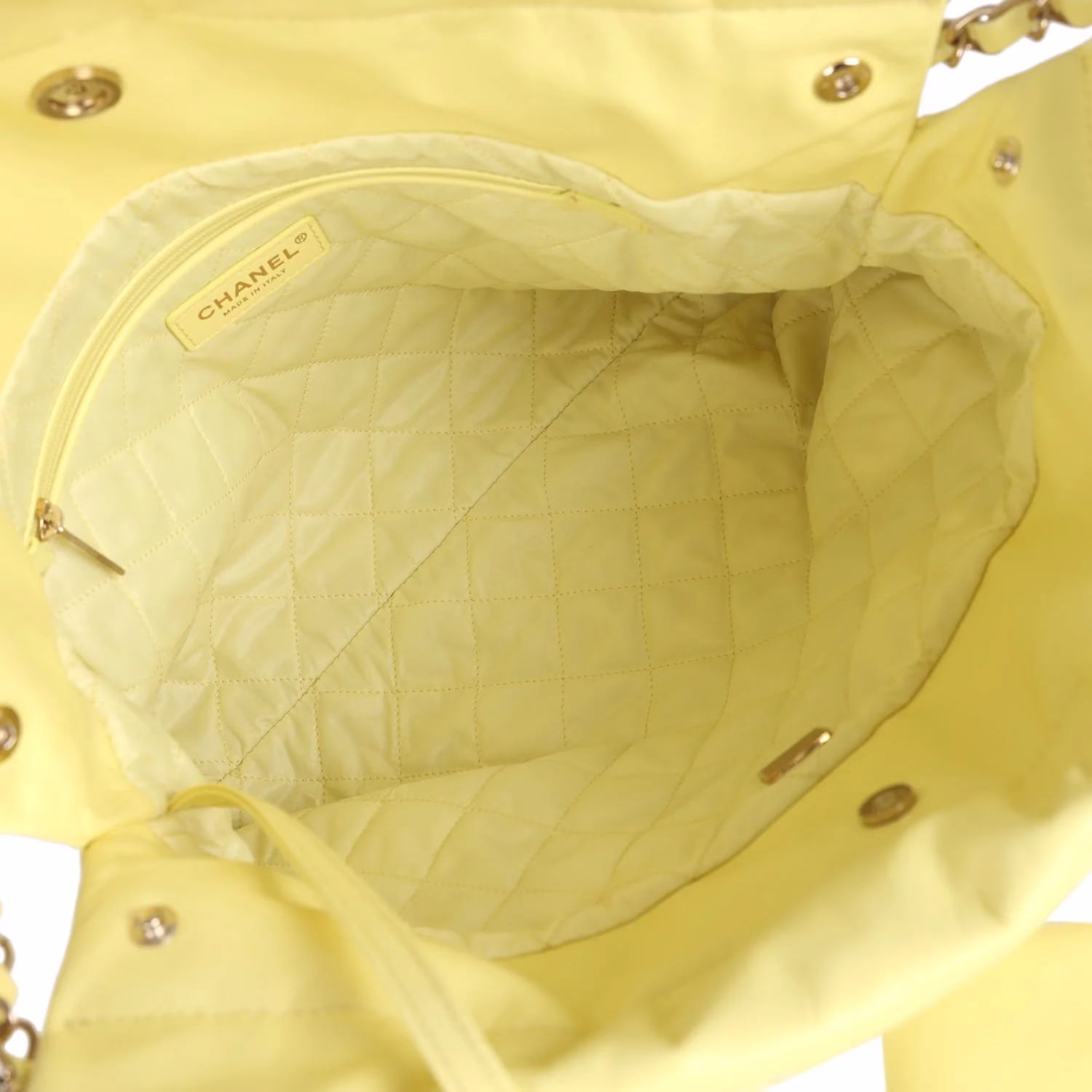 Chanel Mini 22 Yellow Calfskin Bag for sale. The interior is lined in yellow fabric with one slip pocket on the rear wall