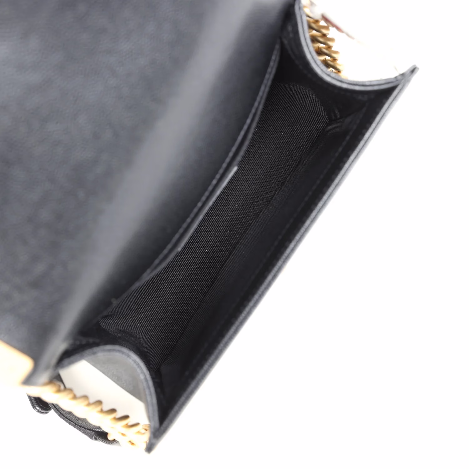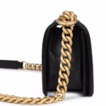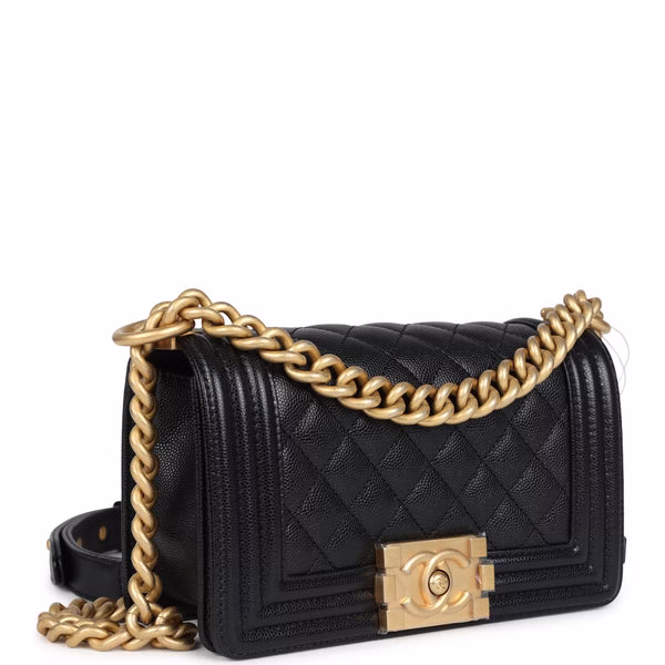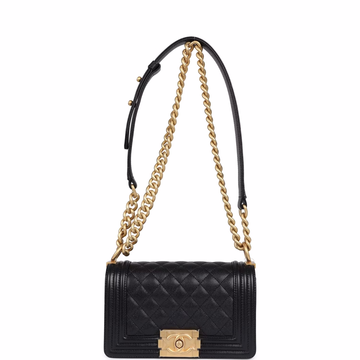 Iconic and timeless, the Chanel Small Boy Bag features sleek black shiny caviar leather paired with antique gold hardware. Its structured silhouette and bold chain strap make it the ultimate statement piece for both day and night looks. A must-have collectible for Chanel lovers.