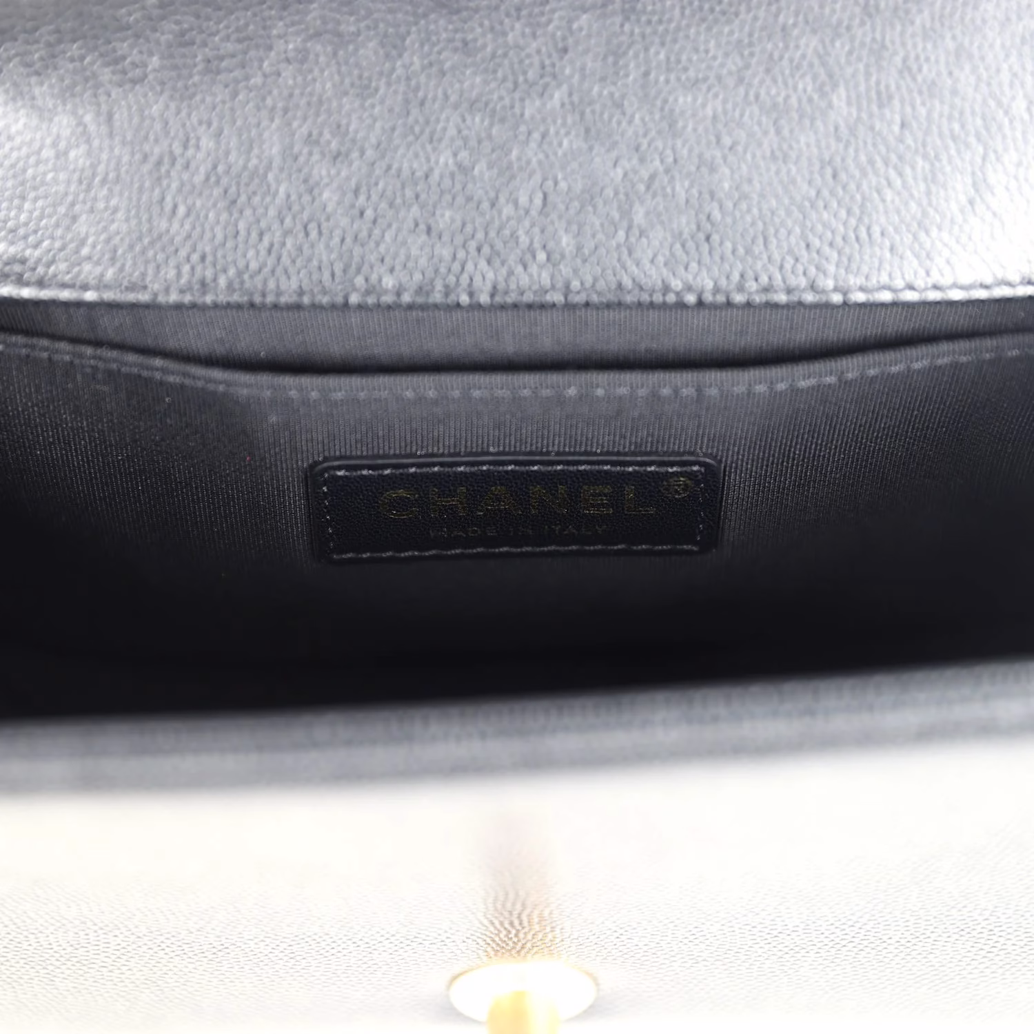 Chanel Small Boy Bag Black Caviar for sale. The interior is lined in black fabric with an open pocket on rear wall
