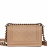 Iconic and elegant, the Chanel Small Boy Bag in beige lambskin with light gold hardware is the perfect blend of classic luxury and edgy appeal. Compact yet spacious, this designer staple complements both casual and formal wardrobes with timeless style.
