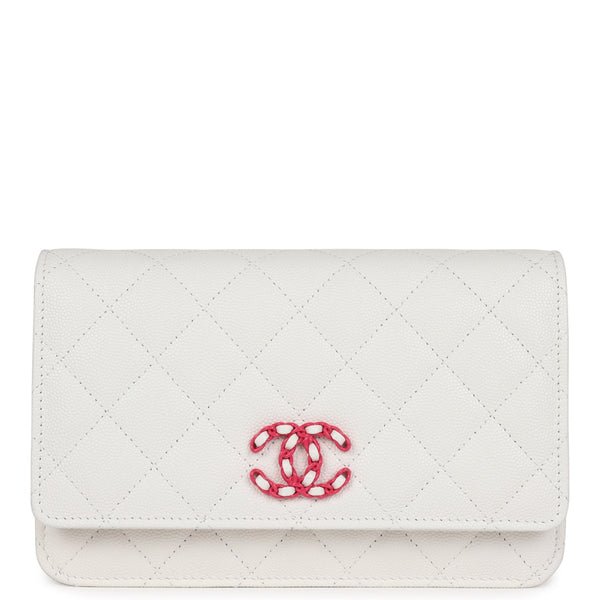 Buy Chanel Wallet On Chain WOC White Caviar Pink and Silver Hardware. This Wallet on Chain is in White caviar Leather with pink and silver hardware, signature half moon exterior back pocket, tonal chain-link crossbody strap/shoulder strap, and front CC button closure. The interior is lined in Pink grossgrain fabric with top zipper pocket under flap, slit front pocket, zipper compartment with pull, open pocket with six credit card slots and open pocket opposite credit card slots.