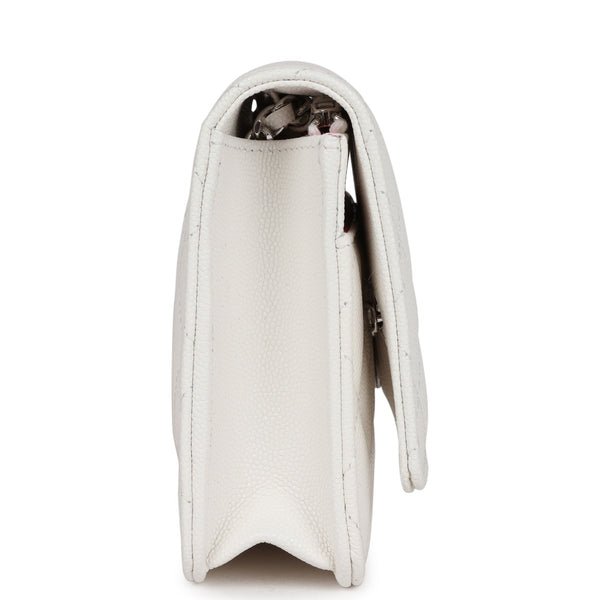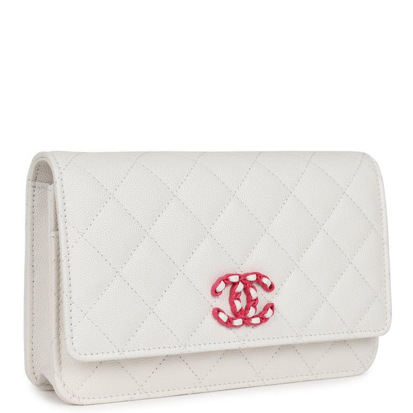 Chanel Wallet On Chain WOC White Caviar Pink and Silver Hardware for sale. This Wallet on Chain is in White caviar Leather with pink and silver hardware, signature half moon exterior back pocket
