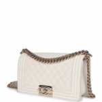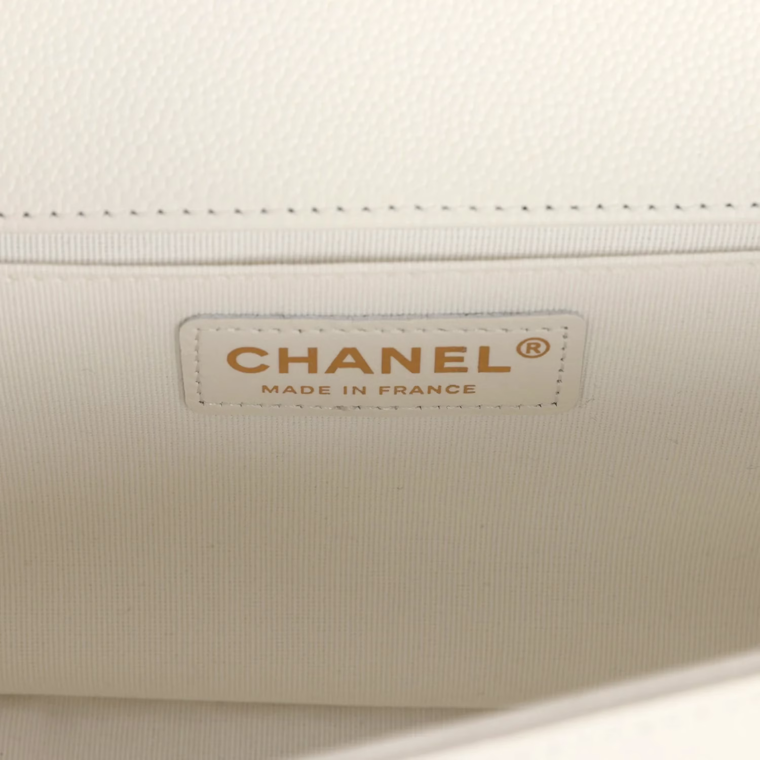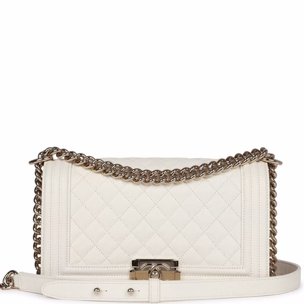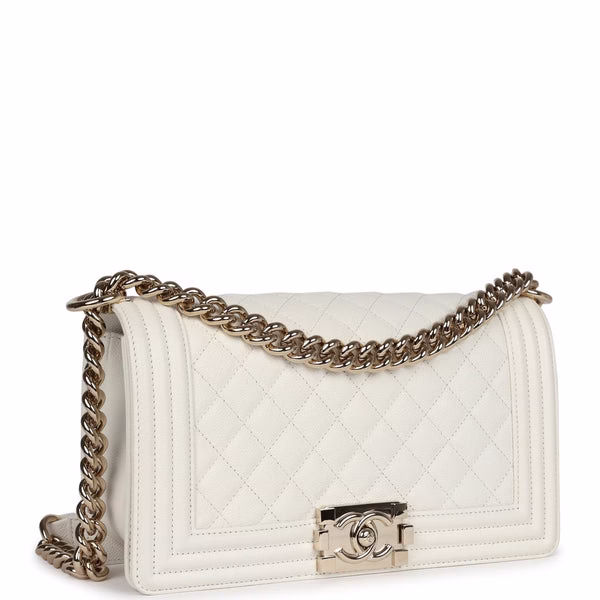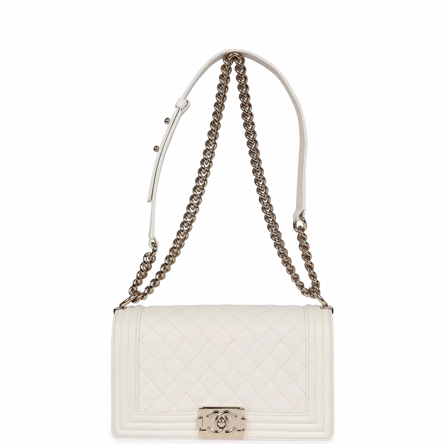 Iconic and timeless, this Chanel Medium Boy Bag is crafted in luxurious white caviar leather with elegant light gold hardware. A bold yet refined statement piece, perfect for day-to-night styling. Structured, versatile, and forever classic.
