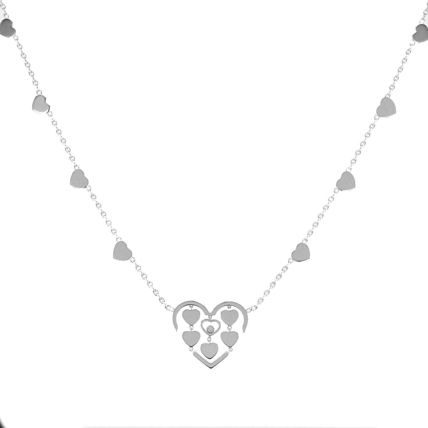Chopard Happy Diamonds necklace in white gold and diamond, stylizing a lovely articulated heart in white gold, decorated with small articulated hearts and a small hemstitched heart in its center enhanced one mobile diamond, hold by one white gold chain enhanced of hearts.