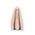 Gold hardware, vachetta leather strap, zip closure