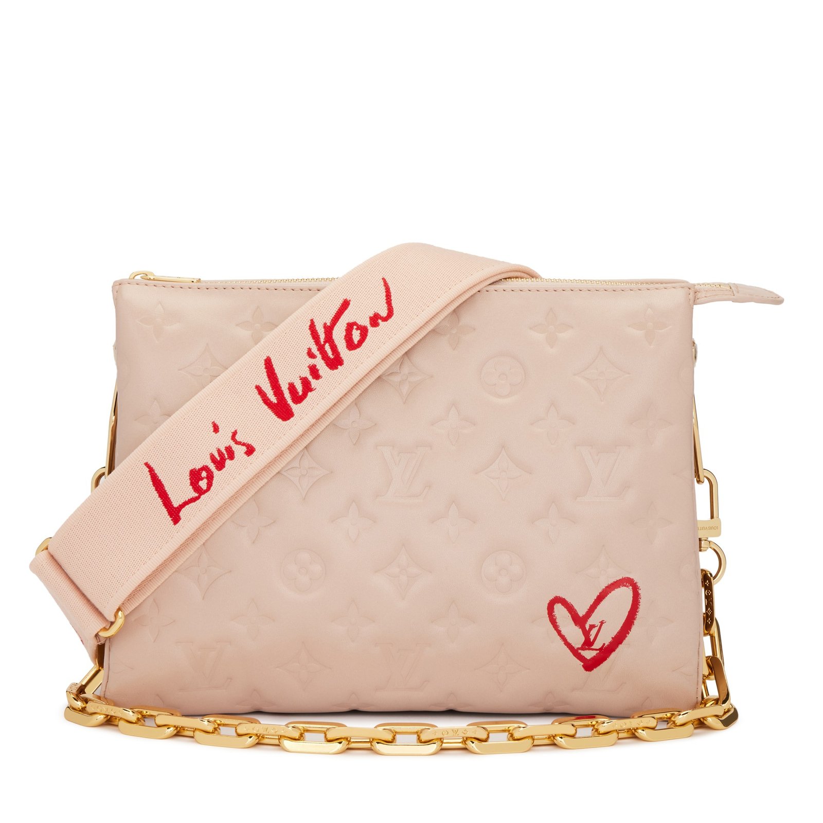 Louis Vuitton Dragée Monogram Puffy Lambskin Fall In Love Coussin PM Gold Hardware, 2021. This bag is lined with red microfiber. This piece was featured in the China exclusive Summer 2021 ‘Fall In Love’ collection. Includes strap, chain, dustbag and box.