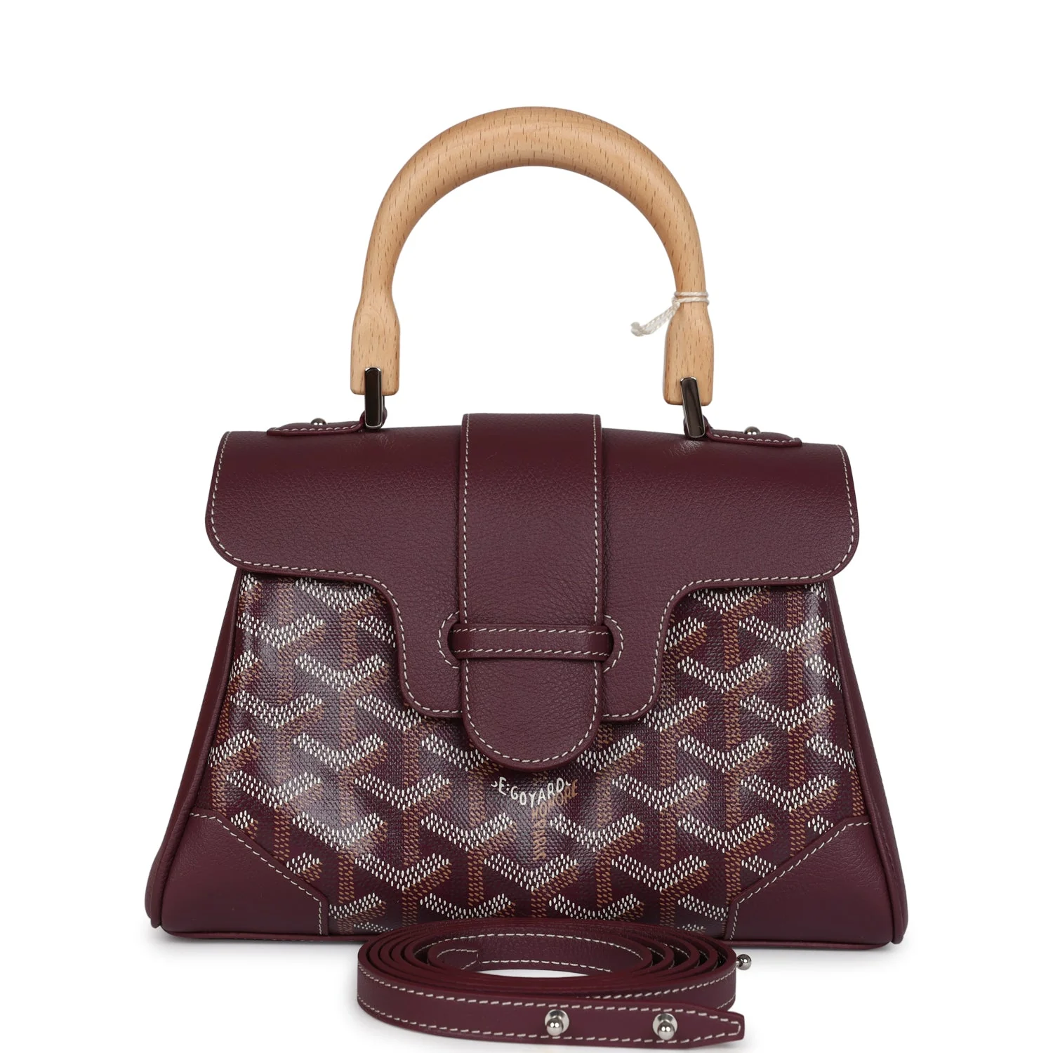 Iconic Goyard Mini Saigon in rich Burgundy Goyardine canvas with palladium hardware for sale. Rare and collectible luxury handbag crafted in France.