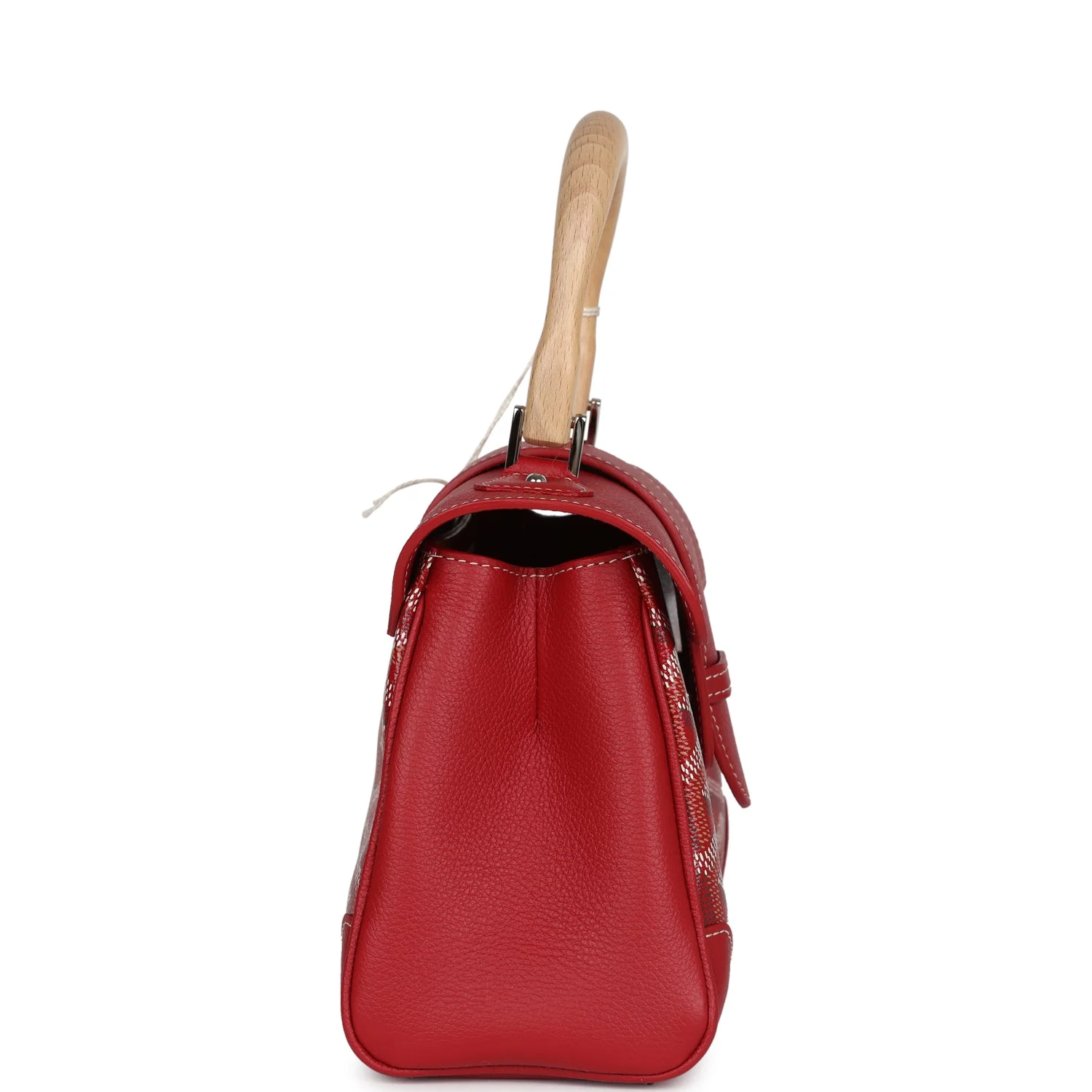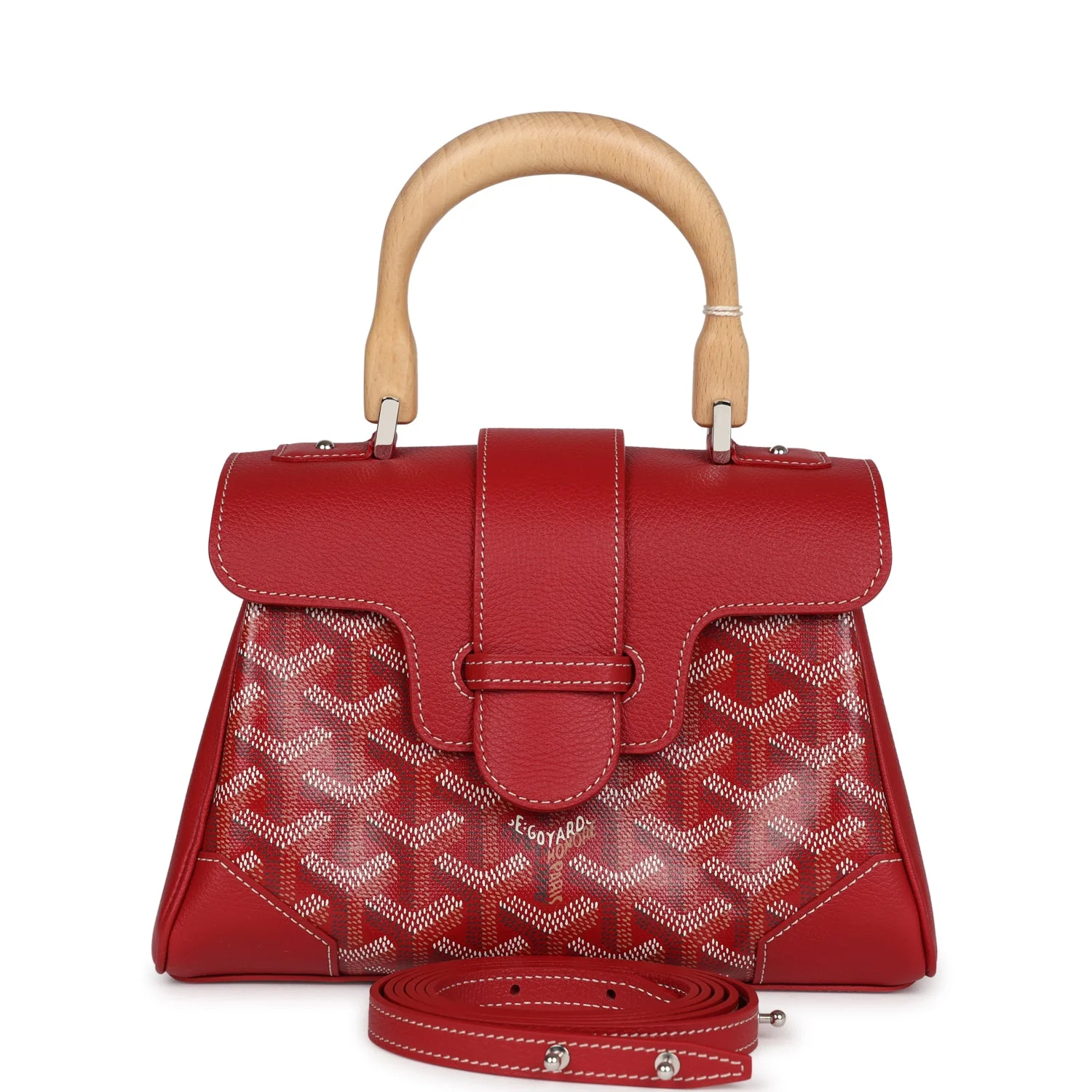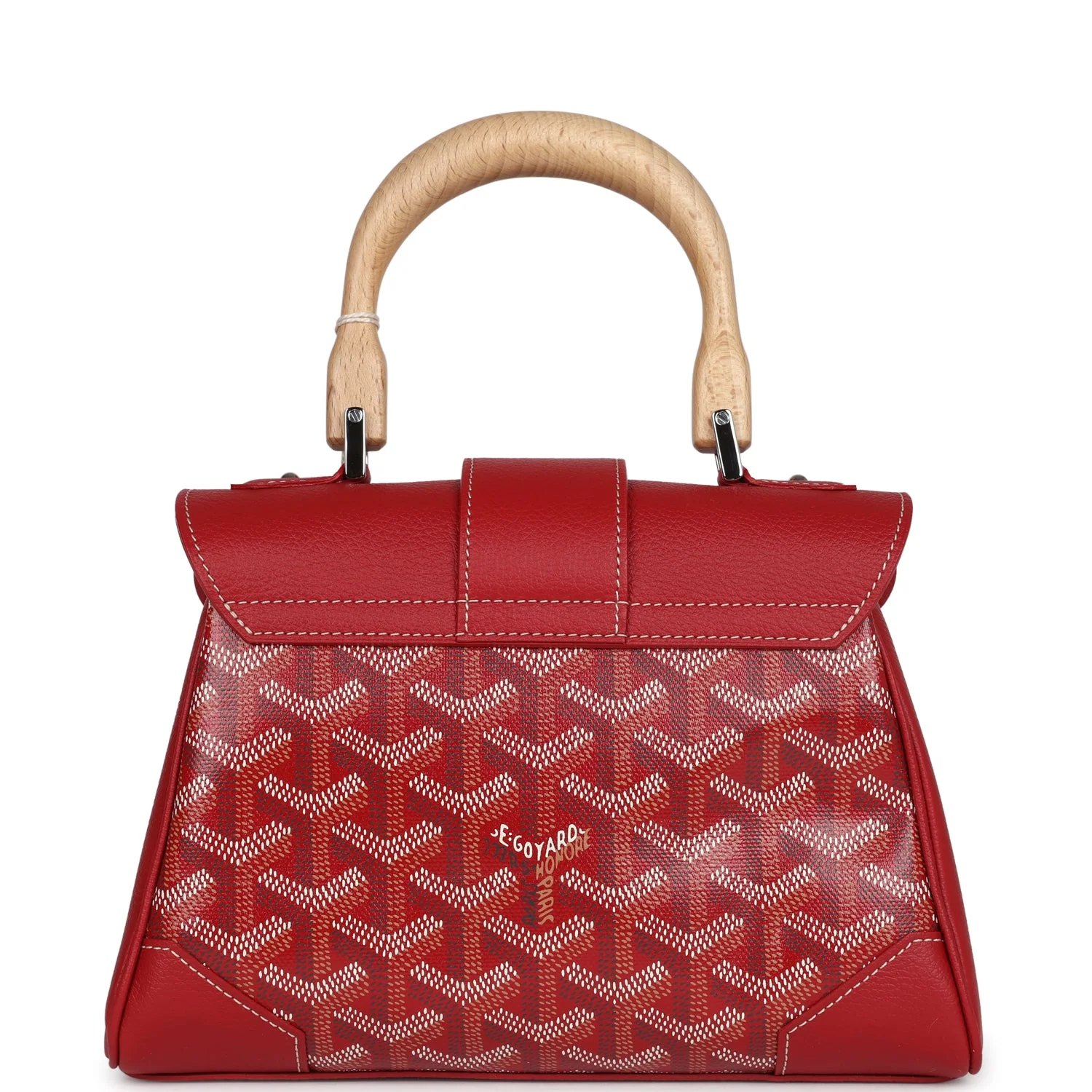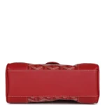 Iconic red Goyard Mini Saigon Souple featuring signature Goyardine canvas, palladium-tone hardware, and wooden top handle. A rare collector’s item with Parisian flair.