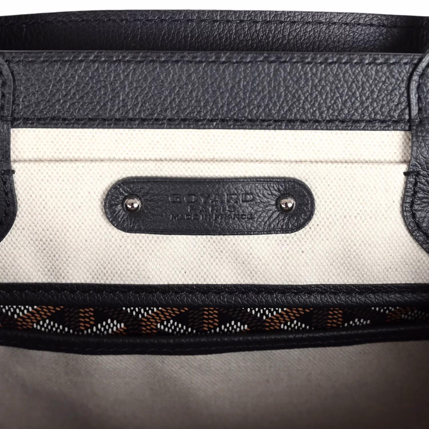 Goyard Saigon Black Tote for sale. The Interior is lined is white canvas and black chevroches calfskin, single floating pocket and a wooden detail on back of bag with palladium studs.