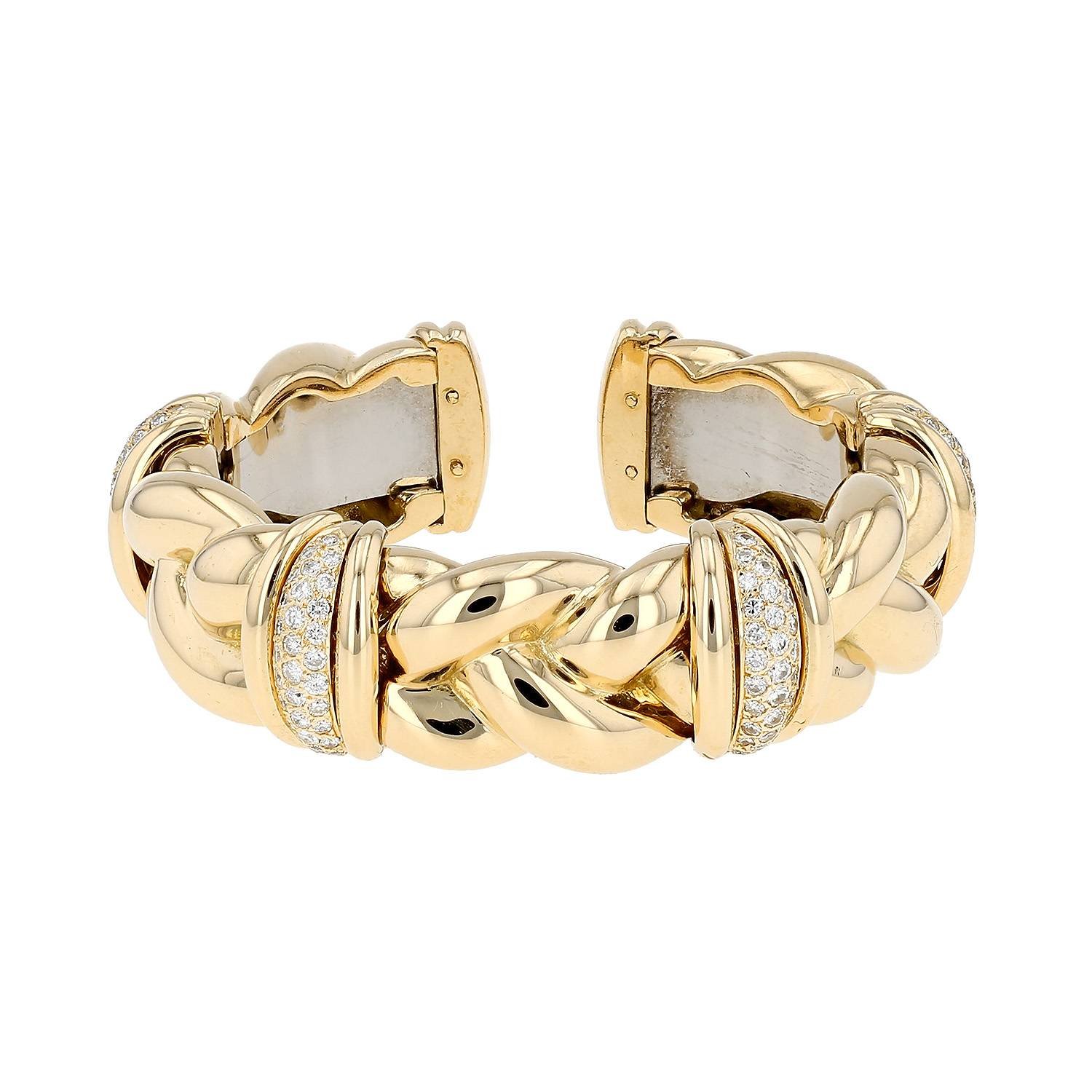 Open hald-rigid Vintage bracelet in yellow gold, in stainless steel, and in diamonds, composed of one braided bangle in yellow gold delicately set with of brilliant cut diamonds about 1.2 carat.