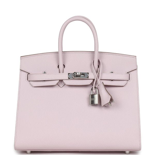 Buy Hermes Birkin Sellier 25 Mauve Pale Epsom Palladium Hardware. This Birkin, in the Sellier style, is in Mauve Pale epsom leather with palladium hardware and has tonal stitching, front flap, two straps with center toggle closure, clochette with lock and two keys, and double rolled handles. The interior is lined with Mauve Pale chevre and has one zip pocket with an Hermes engraved zipper pull and an open pocket on the opposite side.