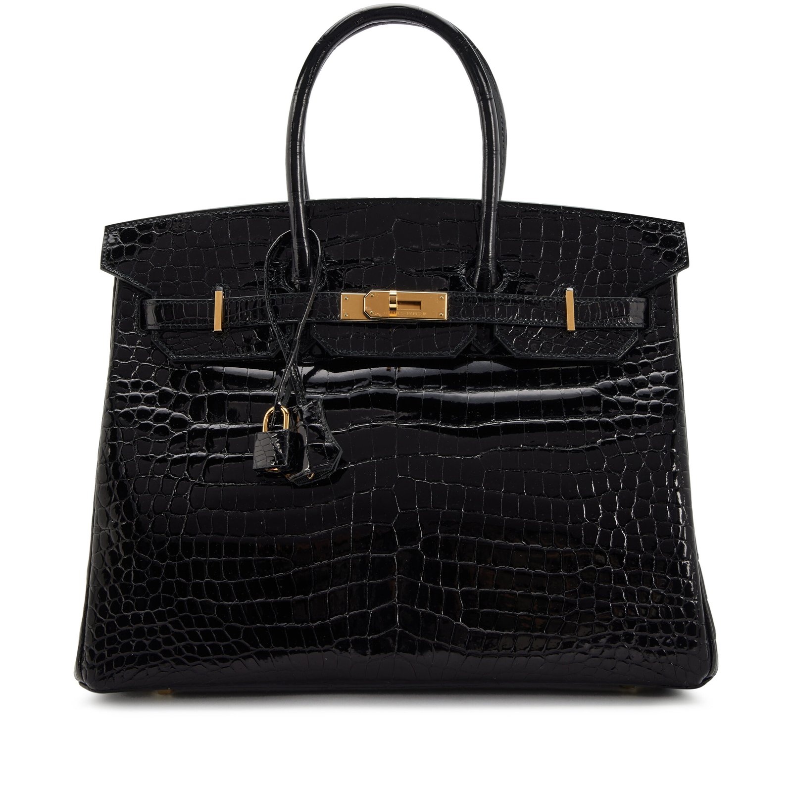 Hermès Black Shiny Porosus Crocodile Birkin 35 Gold Hardware, 2022 for sale. The interior is lined in a tonal chèvre leather. Includes lock, two keys, clochette, clochette dust bag, ribbon, care booklet, felt protector, raincoat, dust bag, and box. This item is final sale and not eligible for return.