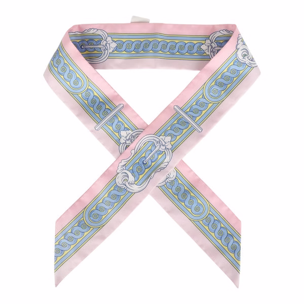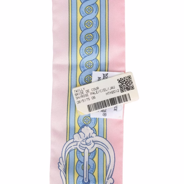This Hermes Brides De Cour silk twilly is of Rose Pale, Ciel and Jaune, designed by Françoise de La Perrière, in a light pink colorway.