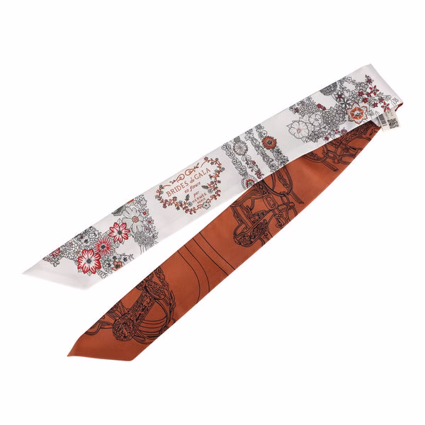 This Hermes Brides de Gala silk twilly pair is of Blanc, Cuir and Gris, designed by Christine Henry and Hugo Grygkar, in a white colorway.