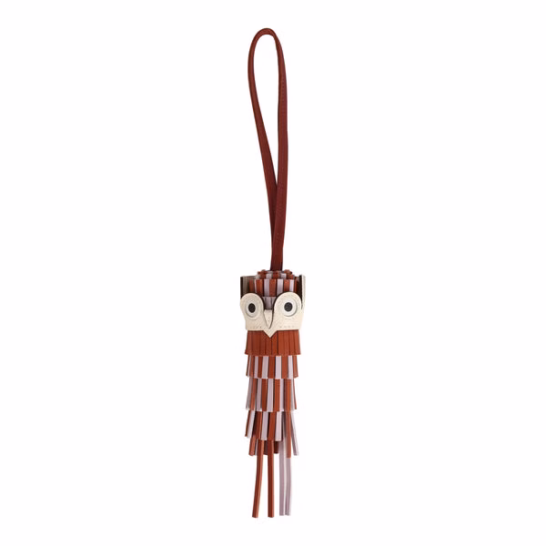 This Chouette Owl Bag Charm is in Pain D’Epice, Mauve Pale, and Sienne Milo lambskin and swift leather, and Nata epsom leather.