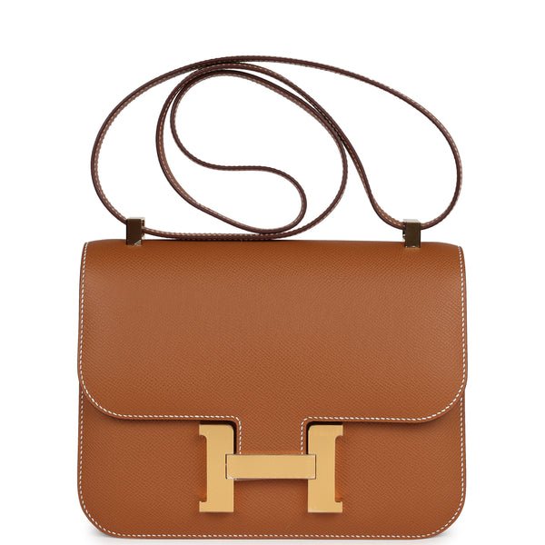 Buy Hermes Constance 1-24 Gold Epsom Gold Hardware. This Constance is in Gold epsom leather with gold hardware and has tonal stitching, a metal “H” snap lock closure and adjustable shoulder strap. The interior is lined with Gold lambskin leather and has a zip pocket with an Hermes engraved pull, two slip pockets and a removable mirror.