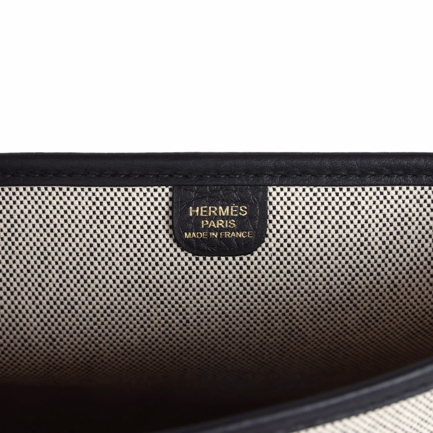 This Evelyne is in Black and Ecru toile canvas with Black clemence leather trim with gold hardware, tonal stitching, large perforated H in circle (front), pull tab top snap closure and removable Black shoulder/crossbody strap, with exterior back pocket. The interior is lined in Ecru Toile H canvas.