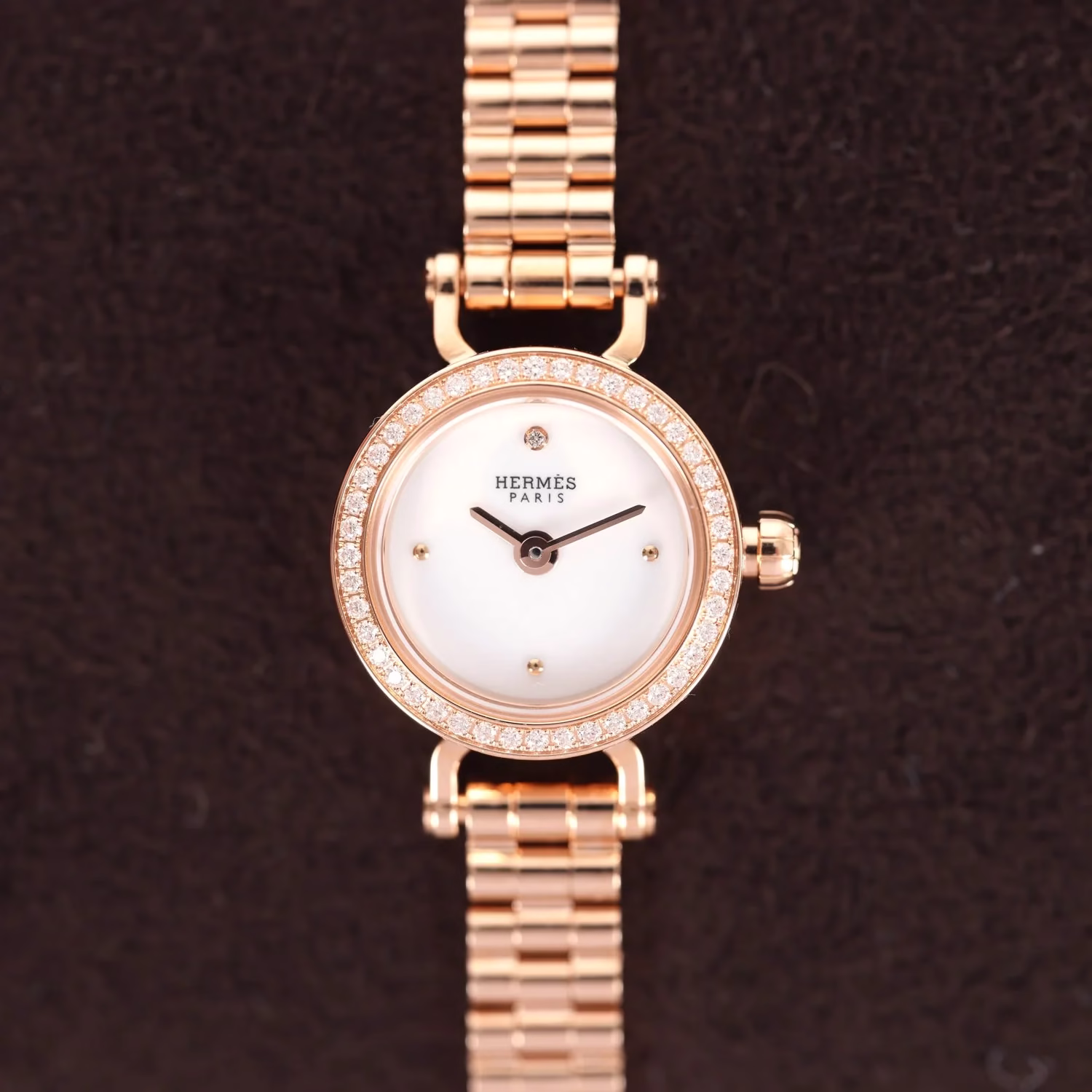 The Hermès Faubourg Mini Watch is the epitome of refined elegance, featuring a white lacquered dial, 18K rose gold case, and brilliant-cut diamond accents