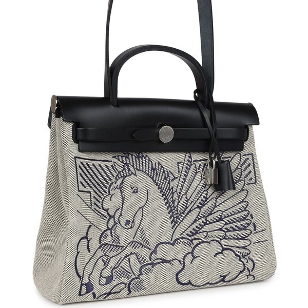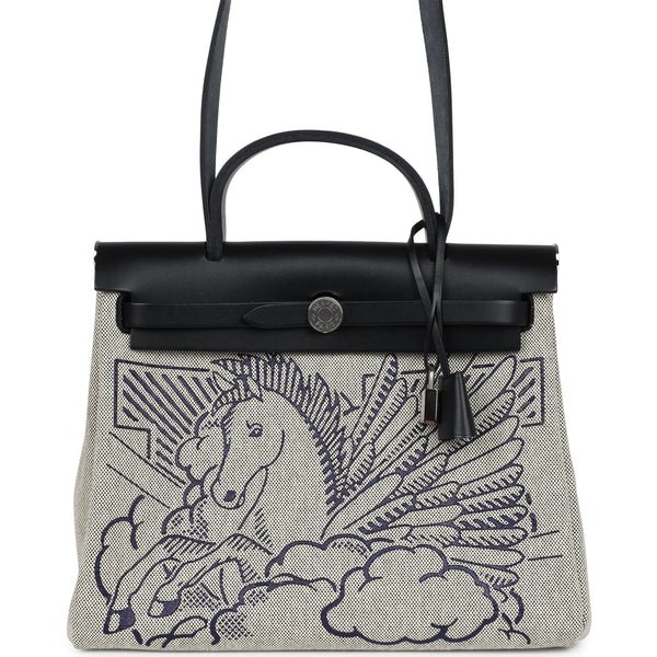 Buy Hermes Herbag Zip Pegase Pop PM 31 Ecru Toile H Canvas and Black Hunter Palladium Hardware. This limited edition Hermes Herbag Zip Pegase Pop PM 31 is in Black hunter leather and Toile H canvas with palladium hardware. It features a hand-painted Pegasus horse design on the front, has tonal stitching, front flap, two straps with center clou de selle closure, clochette with lock and two keys, back zip pocket, single rolled handle and shoulder strap.The interior is lined with Black Toile H canvas and has a removable zip pouch.