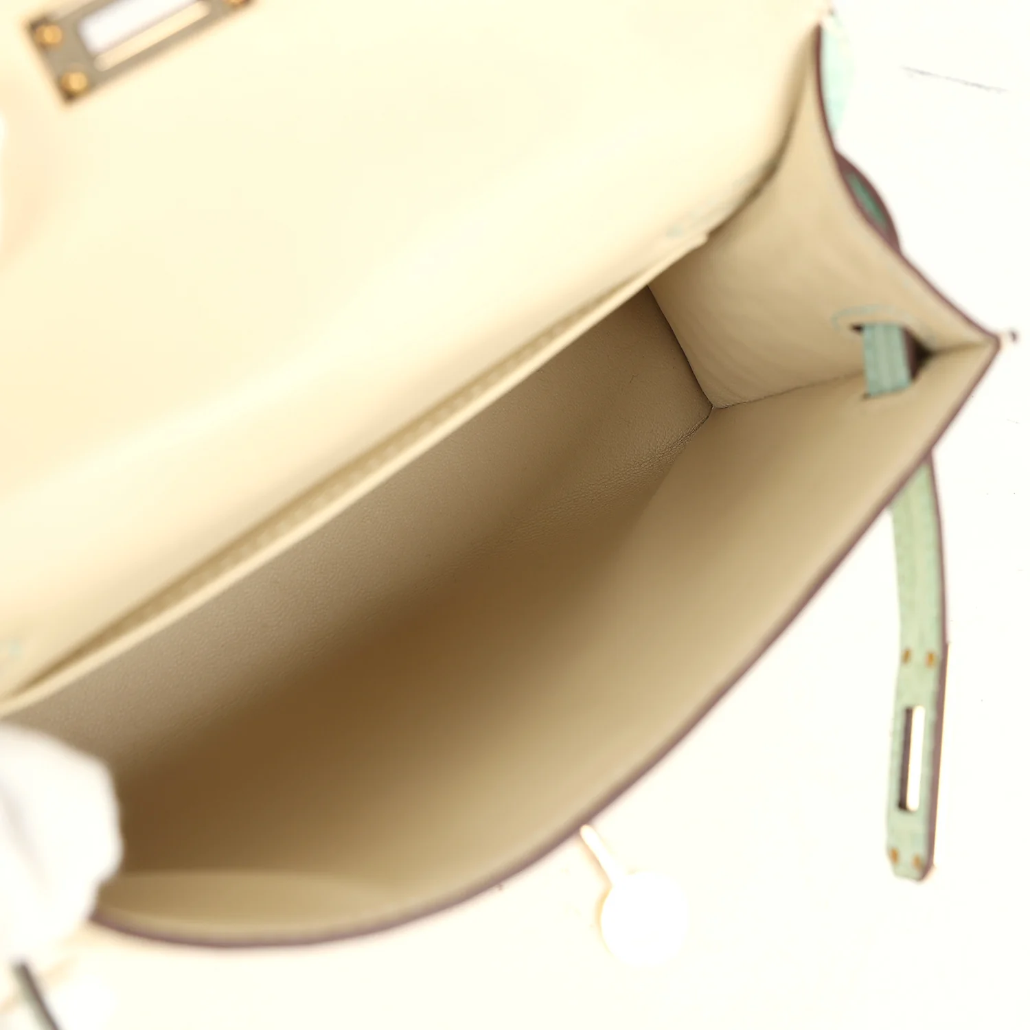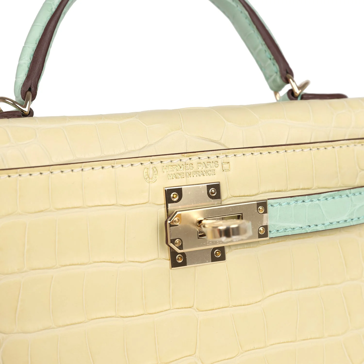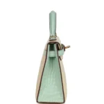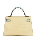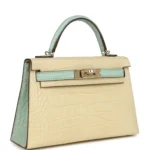 A bespoke mini Kelly bag crafted from rare matte alligator in Vanille and Vert D’Eau, accented with subtle permabrass hardware for sale—elegance redefined.