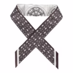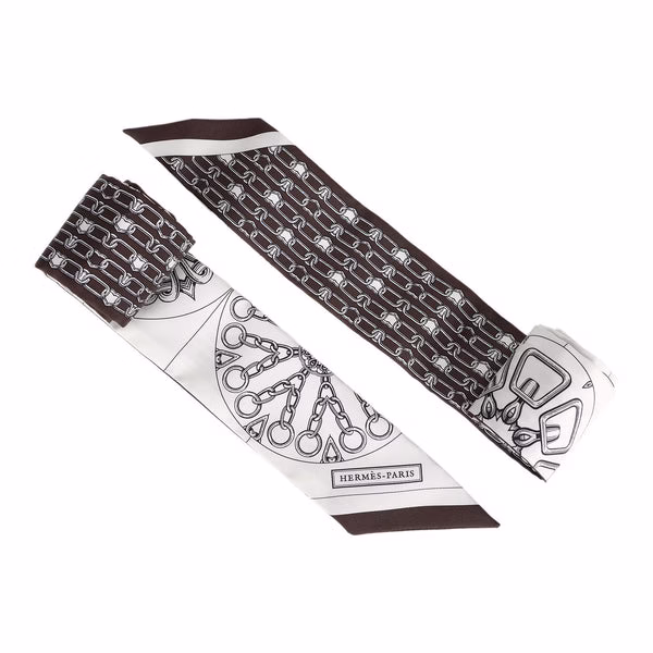 This Hermes L’ Effet Kaleidoscope silk twilly pair is of Blanc, Anthracite and Marron designed by Gianpaolo Pagni , in a mutli colorway.