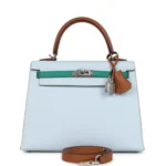 Discover the exceptional craftsmanship of this Hermès Kelly Sellier 25 Tri-Color Epsom with Palladium Hardware. Finished with PHW, this structured mini Kelly in Bleu Brume, Gold, and Vert Jade, is the epitome of elegance and exclusivity. Ideal for collectors and lovers of rare Hermès colorways, this 2023 edition is a highly sought-after piece and a timeless investment.