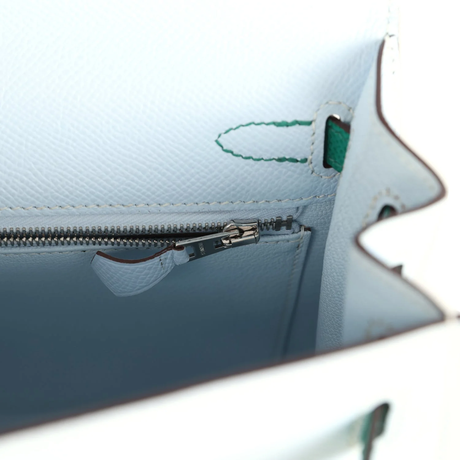 Rare Hermès Kelly Sellier 25 in Tri-Color Bleu Brume, Gold & Vert Jade for sale. Epsom leather with PHW (Palladium hardware). A true investment in iconic luxury