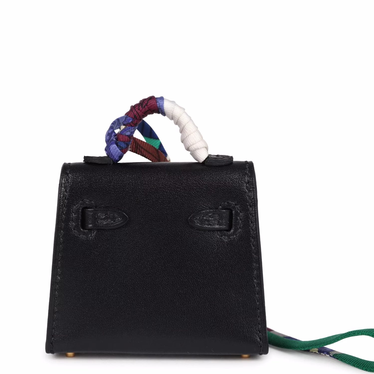 This Mini Kelly Twilly Bag Charm is of Black tadelakt leather with gold hardware and has tonal stitching, a front flap that opens, silk twilly wrapped handle and matching decorative strap.