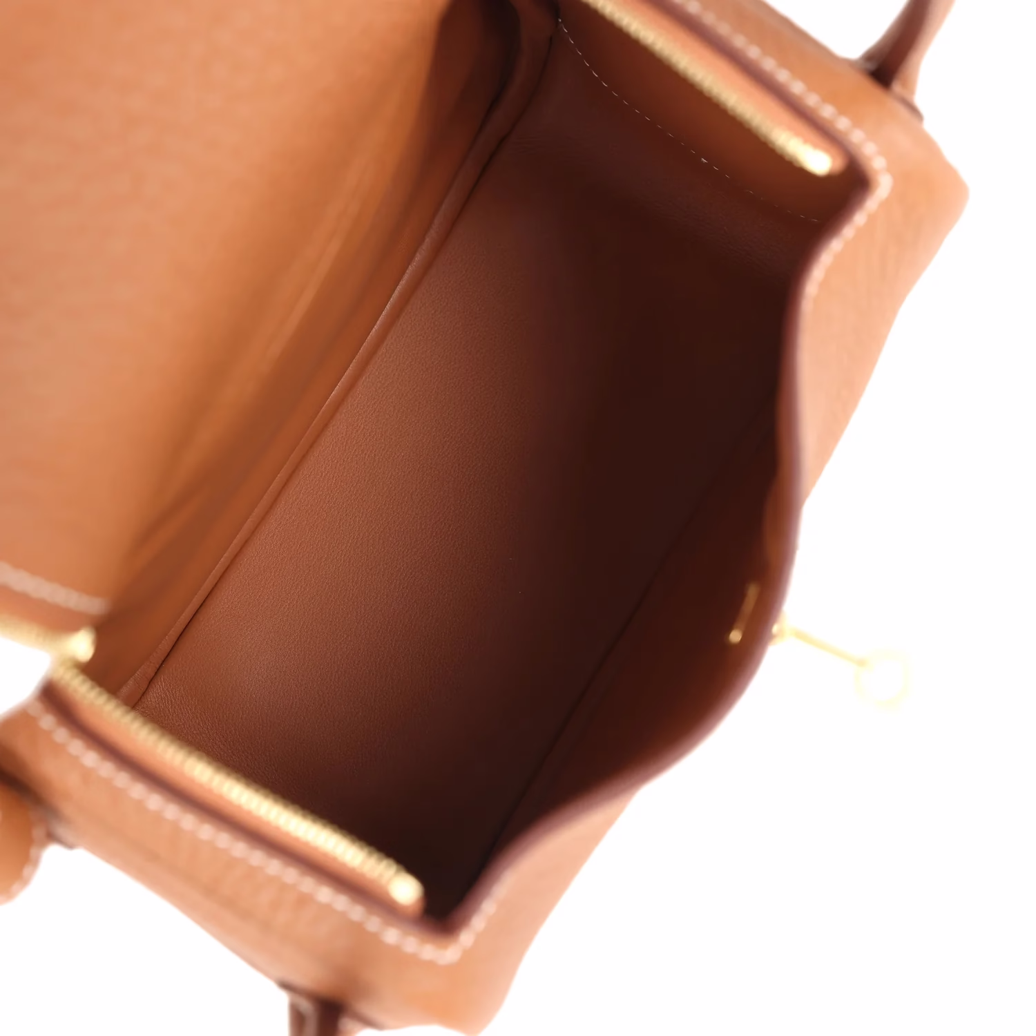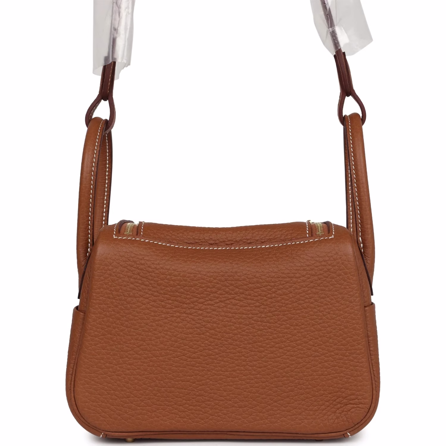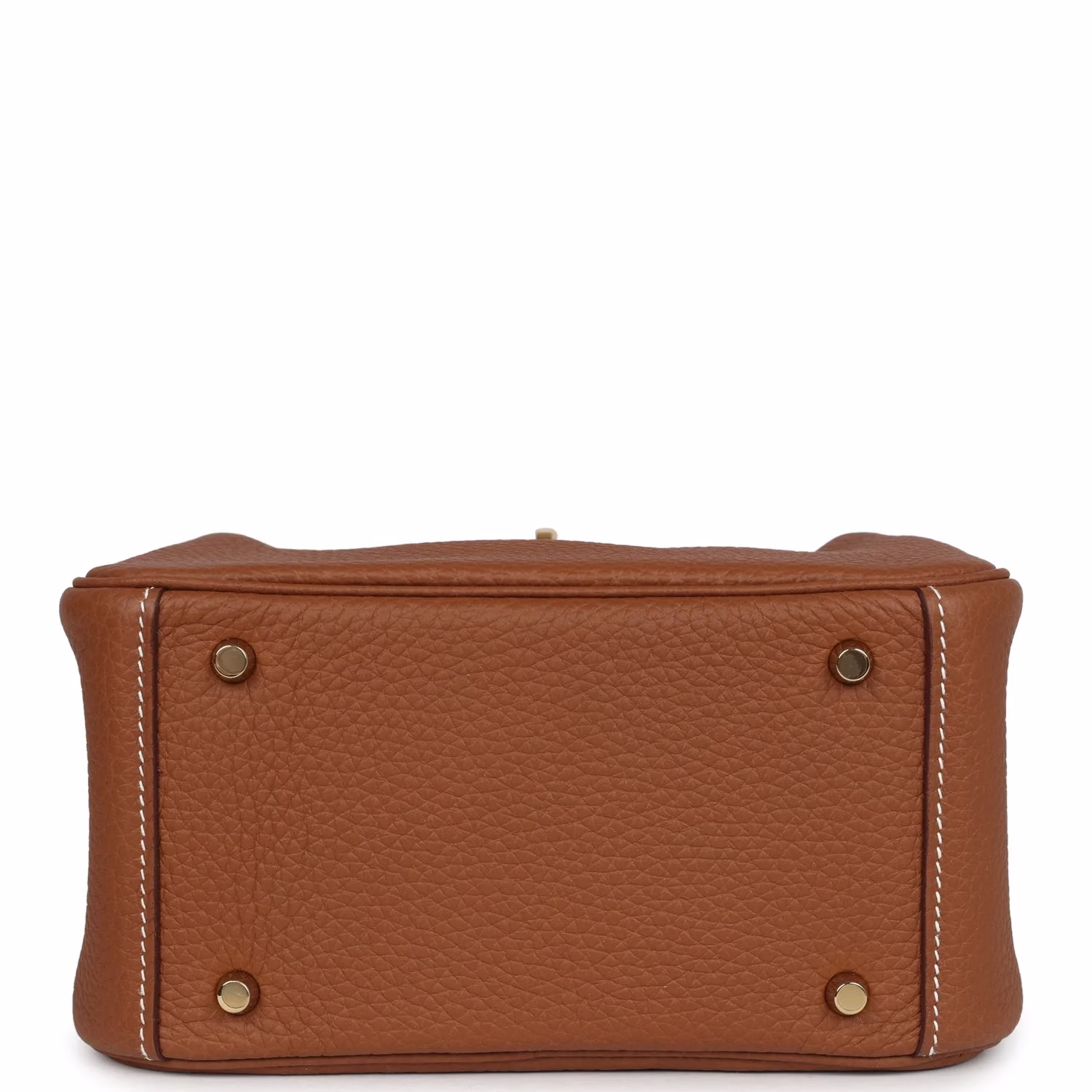 This Hermès Mini Lindy Gold is in Gold clemence leather with gold hardware and has contrast stitching, double zipper pulls, front Hermès twist lock, single pocket on each side, two rolled top handles linked by a flat shoulder strap.