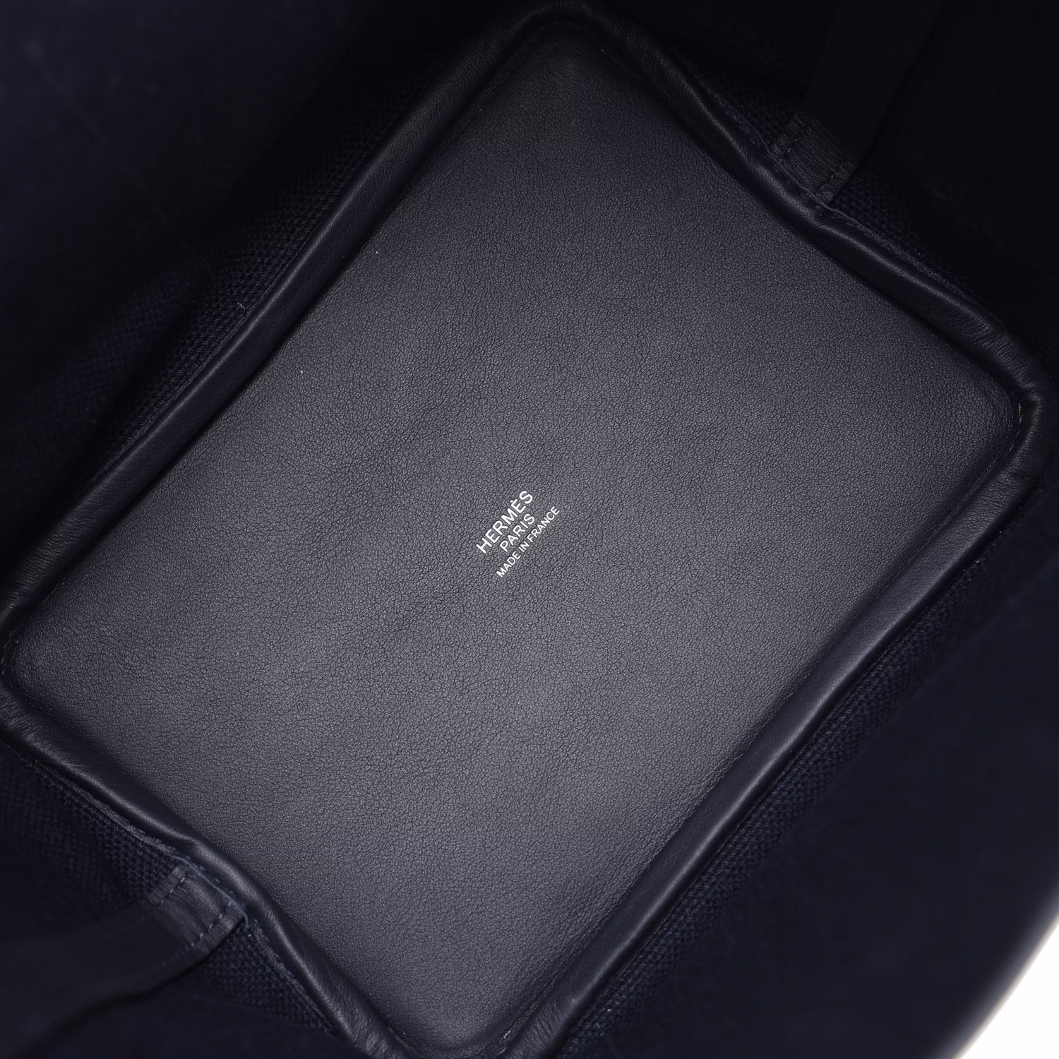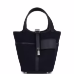 This Cargo Picotin Lock is in Bleu Marine swift leather and Caban toile with palladium hardware and has tonal stitching, four exterior pockets with two top handles. The interior is lined with natural leather, no interior pockets and has a pull through closure secured by padlock.