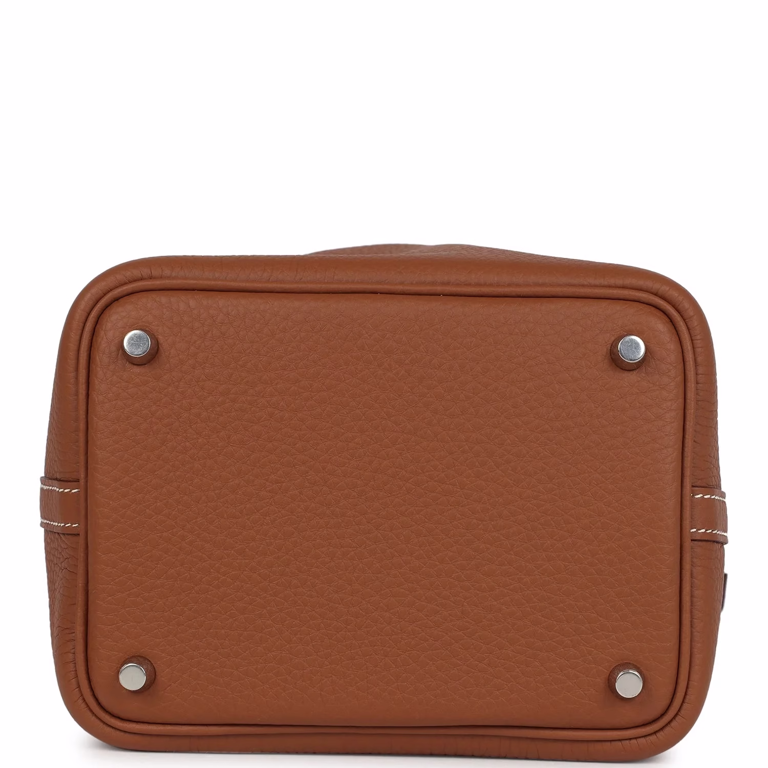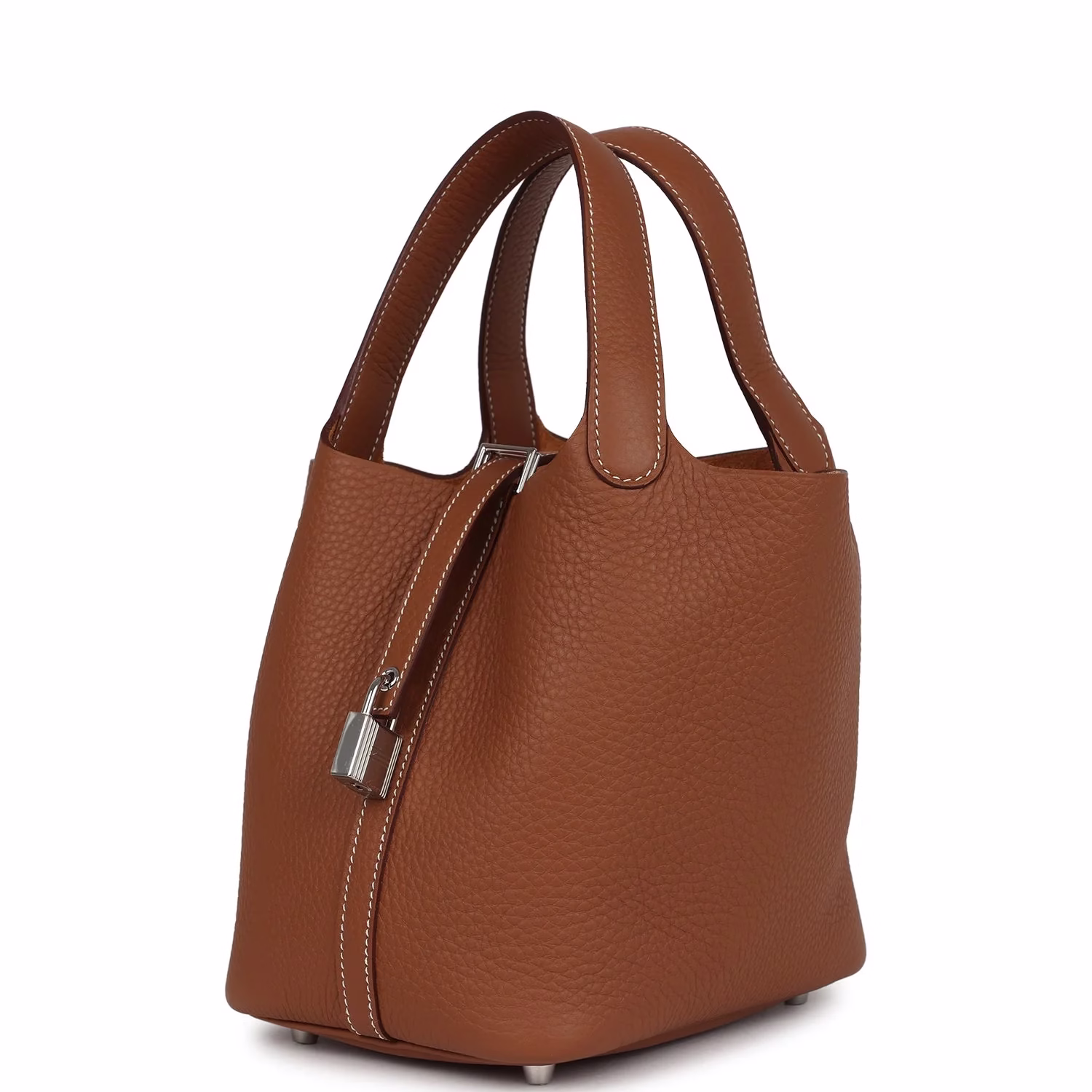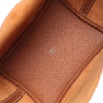 This Picotin Lock is in Gold clemence leather with palladium hardware and has contrast stitching with two top handles. The interior is lined with Gold natural leather, no interior pockets and has a pull through closure secured by padlock.