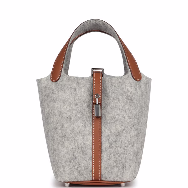 This Picotin Lock is in Gris Clair Feutre felt and Gold swift leather with palladium hardware and has contrast stitching with two top handles, lock and two keys. The interior is lined with Gris Clair Feutre felt and Gold swift leather, no interior pockets and has a pull through closure secured by padlock.