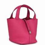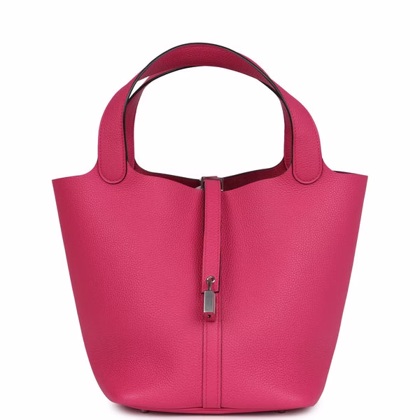 This Picotin is in Rose Shocking Maurice Taurillon leather with palladium hardware and has tonal stitching with two top handles. The interior is lined with Rose Shocking natural leather, no interior pockets and has a pull through closure secured by padlock.
