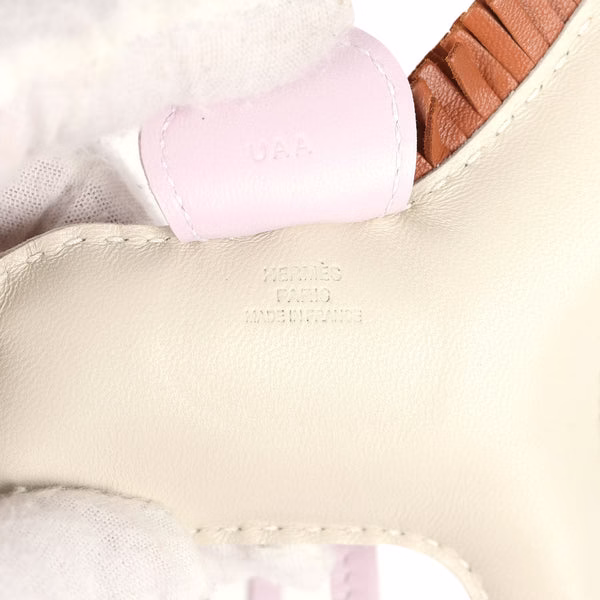 Elevate your handbag with the Hermès Rodeo MM Bag Charm, crafted from ultra-soft Milo lambskin in the elegant Craie, Gold, and Mauve Pale colorway