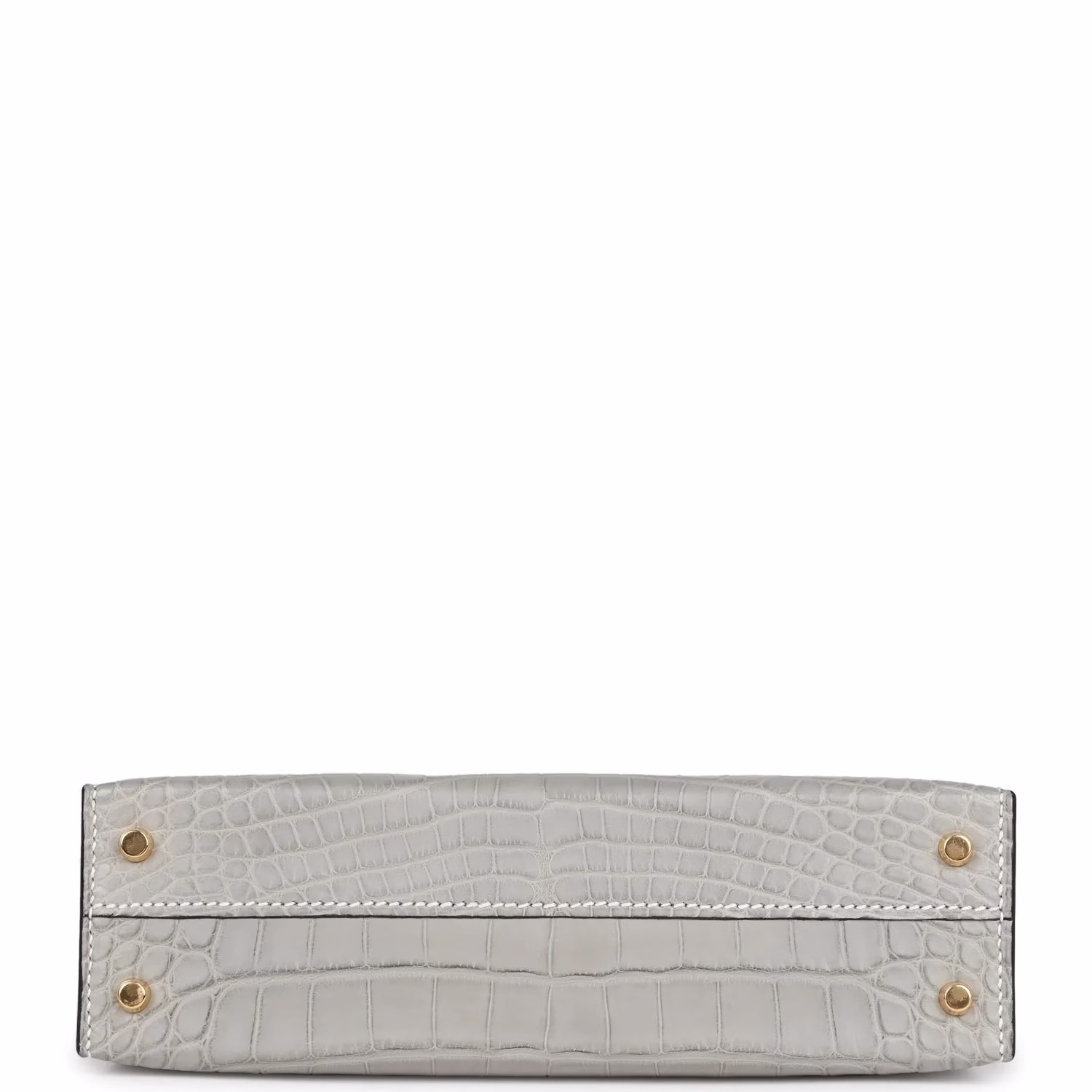 Hermes Kelly Sellier 20 Beton Matte Alligator Gold Hardware.  This tiny Kelly, in the Sellier style, is in Beton matte Mississippienis alligator with gold hardware and has tonal stitching, two