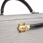 A bespoke mini Kelly bag crafted from rare matte alligator in Vanille and Vert D’Eau, accented with subtle permabrass hardware for sale—elegance redefined.