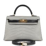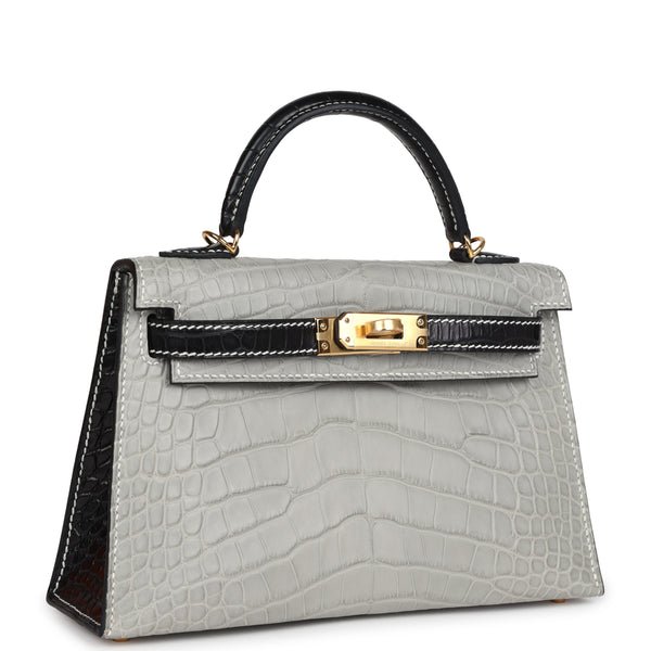 Buy Hermes Special Order (HSS) Kelly Sellier 20 Gris Perle and Black Matte Alligator Gold Hardware. This Special Order Kelly, in the Sellier style, is in Gris Perle and Black Matte Alligator Mississippiensis leather with gold hardware, contrast stitching, front flap with two straps, front toggle closure, removable shoulder strap and single rolled handle.The interior is lined in Gris Perle lambskin leather and has slip pocket on rear wall.