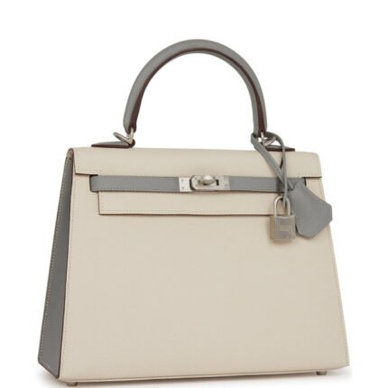 Hermes Special Order (HSS) Kelly Sellier 25 Craie and Gris Mouette Epsom Brushed Palladium Hardware