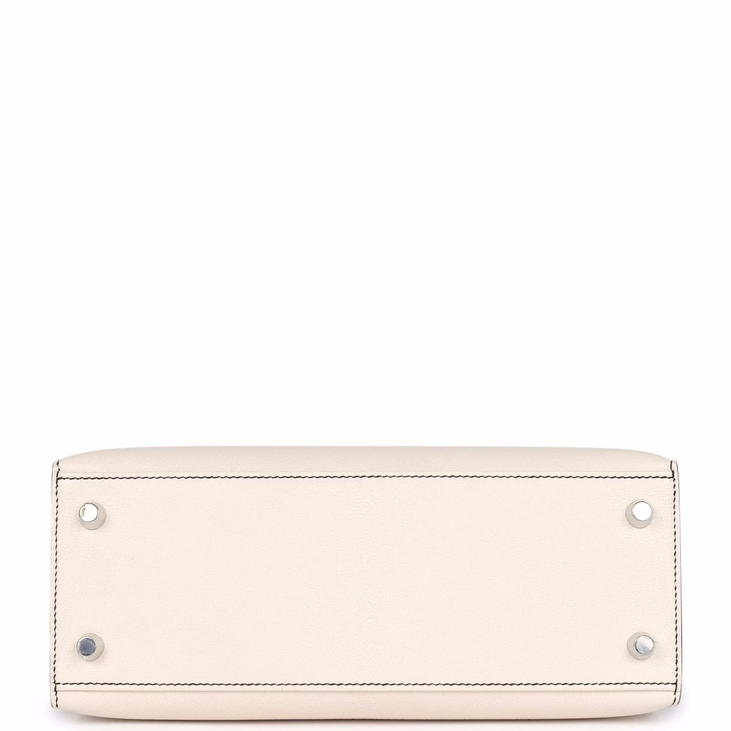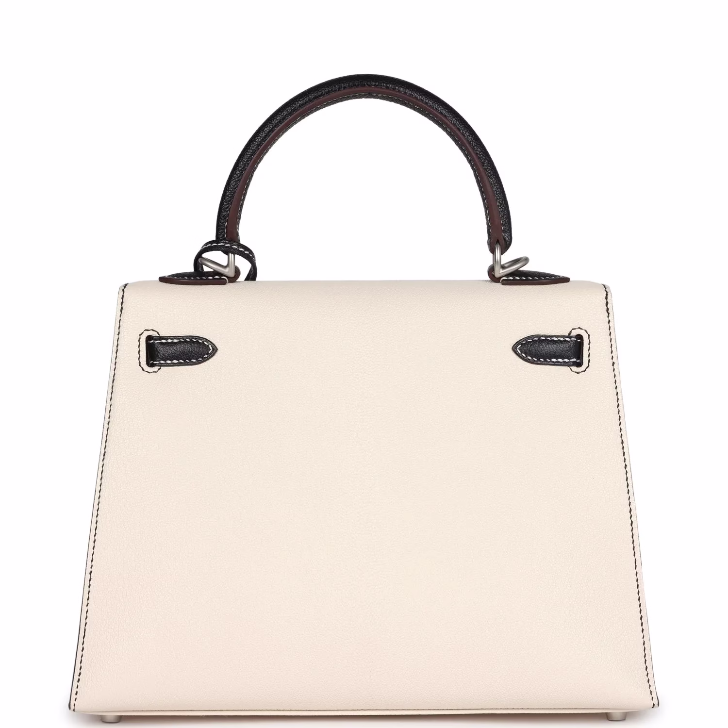 Buy Hermes Special Order (HSS) Kelly Sellier 25 Nata and Black Chevre Mysore Brushed Palladium Hardware. This Special Order Kelly, in the Sellier style, is in Nata and Black chevre mysore leather with brushed palladium hardware and has contrast stitching, two straps with front toggle closure, clochette with a clover symbol, with lock and two keys, single rolled handle and removable shoulder strap. The interior is lined with Nata chevre leather and has one zip pocket with an Hermes engraved pull and one open pocket on the opposite side.